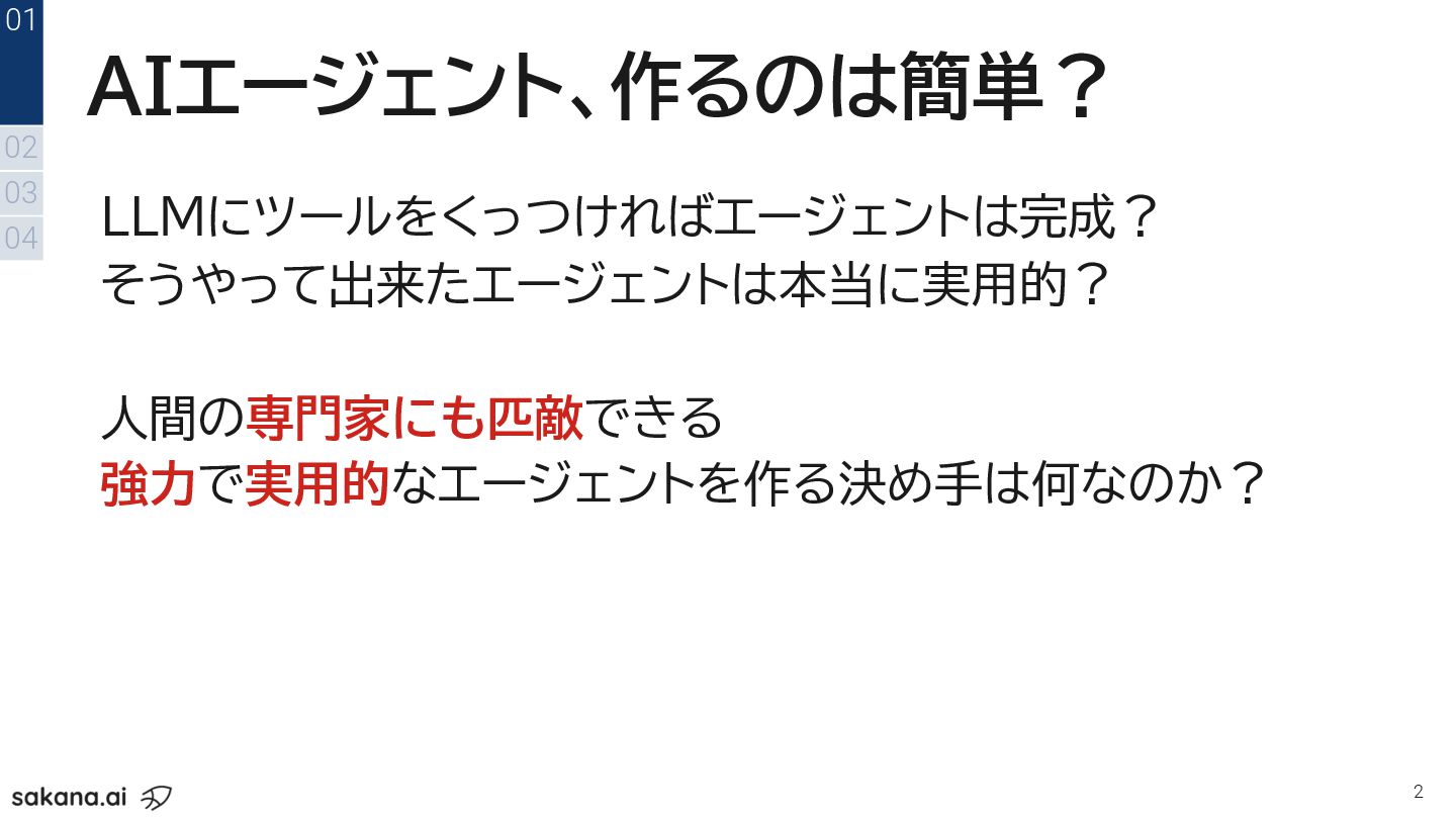AIエージェント、作るのは簡単? 2 LLMにツールをくっつければエージェントは完成? そうやって出来たエージェントは本当に実用的? 人間の専門家にも匹敵できる 強力で実用的なエージェントを作る決め手は何なのか? 02 03 04 01