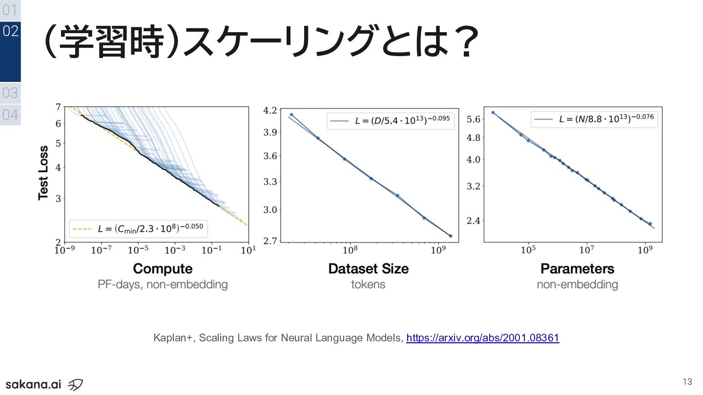 (学習時)スケーリングとは? 13 01 03 04 02 Kaplan+, Scaling Laws for