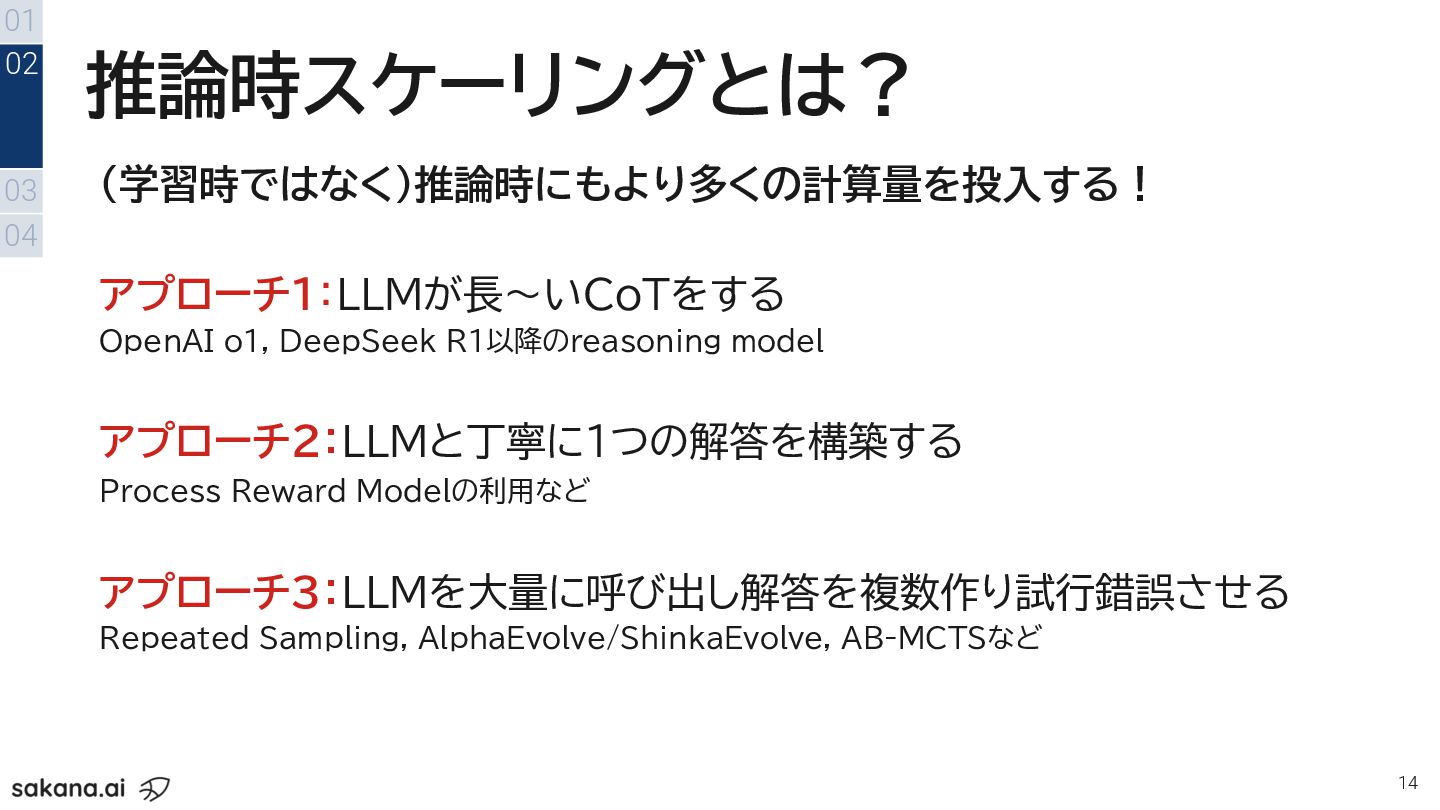 Process Reward Modelの利用など アプローチ3:LLMを大量に呼び出し解答を複数作り試行錯誤させる Repeated Sampling, AlphaEvolve/ShinkaEvolve, AB-MCTSなど 01 03 04 02