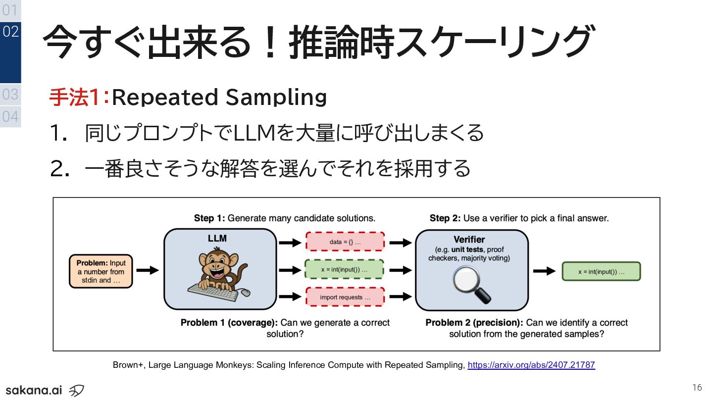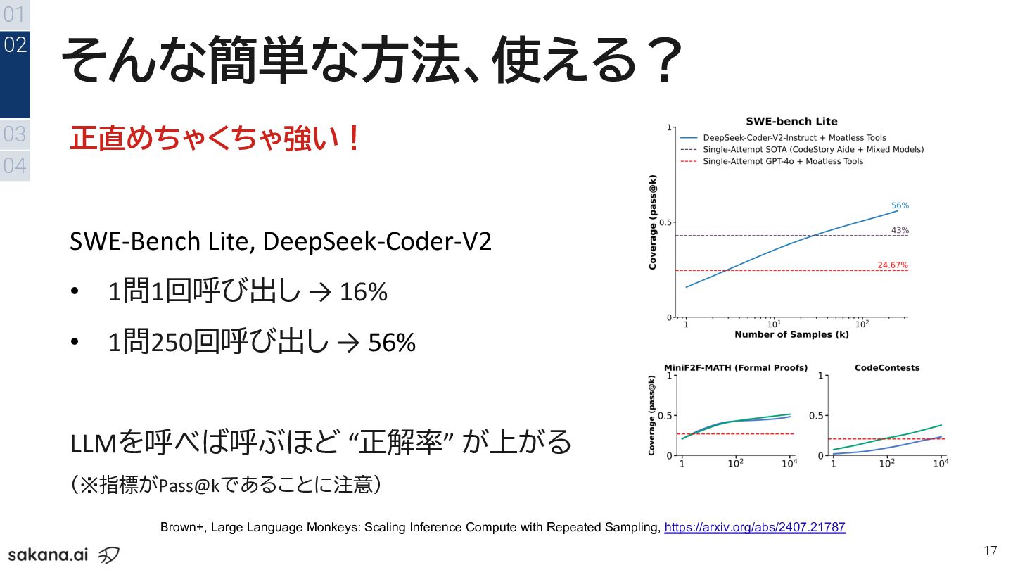 • 1問250回呼び出し → 56% LLMを呼べば呼ぶほど “正解率” が上がる (※指標がPass@kであることに注意) 01 03 04 02 Brown+, Large Language Monkeys: Scaling Inference Compute with Repeated Sampling, https://arxiv.org/abs/2407.21787