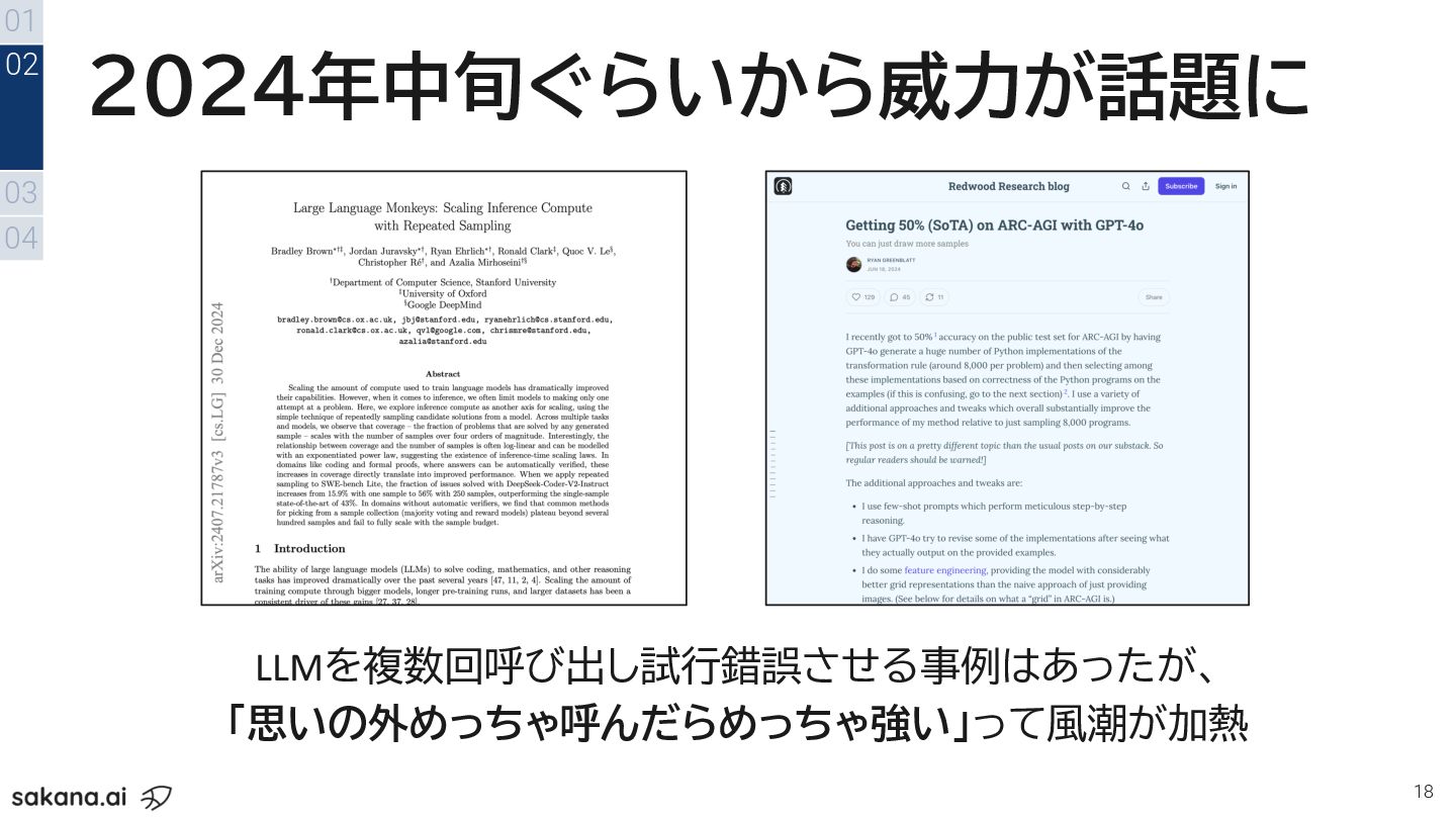 2024年中旬ぐらいから威力が話題に 18 01 03 04 02 LLMを複数回呼び出し試行錯誤させる事例はあったが、 「思いの外めっちゃ呼んだらめっちゃ強い」って風潮が加熱