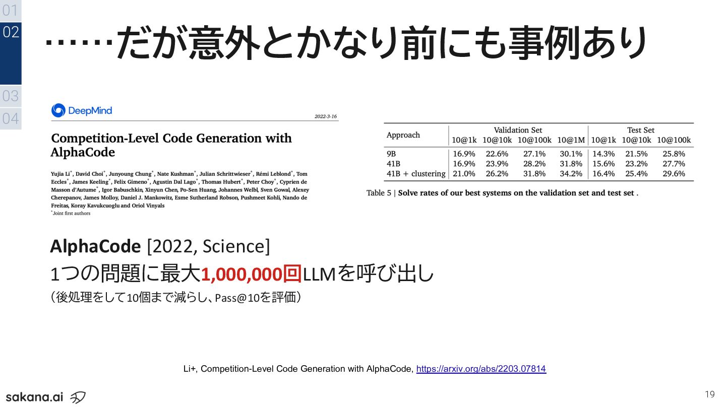……だが意外とかなり前にも事例あり 19 AlphaCode [2022, Science] 1つの問題に最大1,000,000回LLMを呼び出し (後処理をして10個まで減らし、Pass@10を評価) 01 03 04