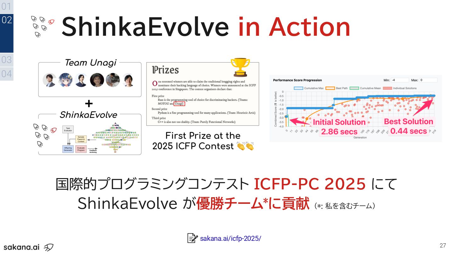 27 01 03 04 02 ShinkaEvolve in Action sakana.ai/icfp-2025/ 国際的プログラミングコンテスト