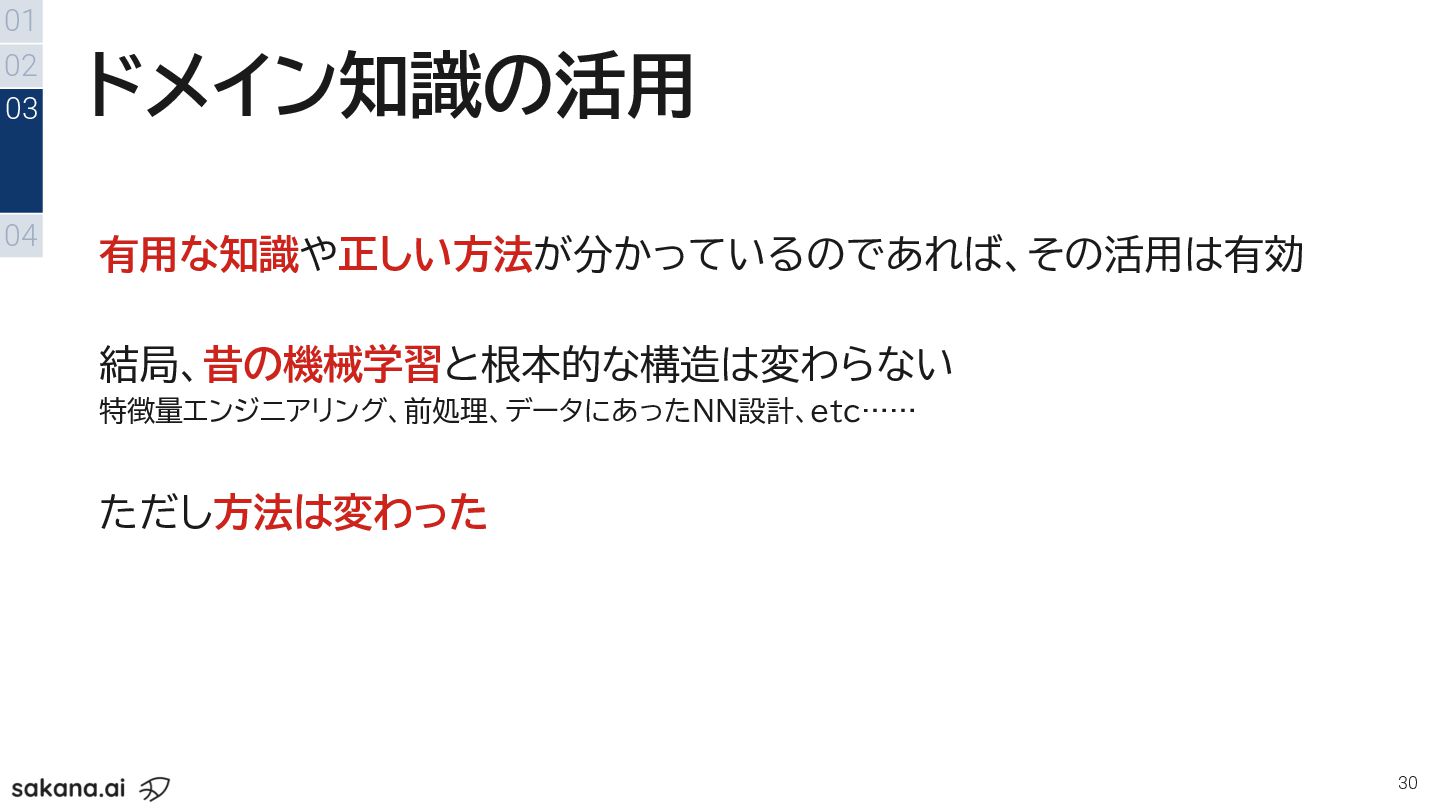 ドメイン知識の活用 30 01 02 04 03 有用な知識や正しい方法が分かっているのであれば、その活用は有効 結局、昔の機械学習と根本的な構造は変わらない 特徴量エンジニアリング、前処理、データにあったNN設計、etc…… ただし方法は変わった