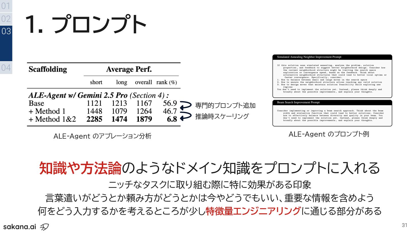 言葉遣いがどうとか頼み方がどうとかは今やどうでもいい、重要な情報を含めよう 何をどう入力するかを考えるところが少し特徴量エンジニアリングに通じる部分がある 推論時スケーリング ALE-Agent のアブレーション分析 ALE-Agent のプロンプト例