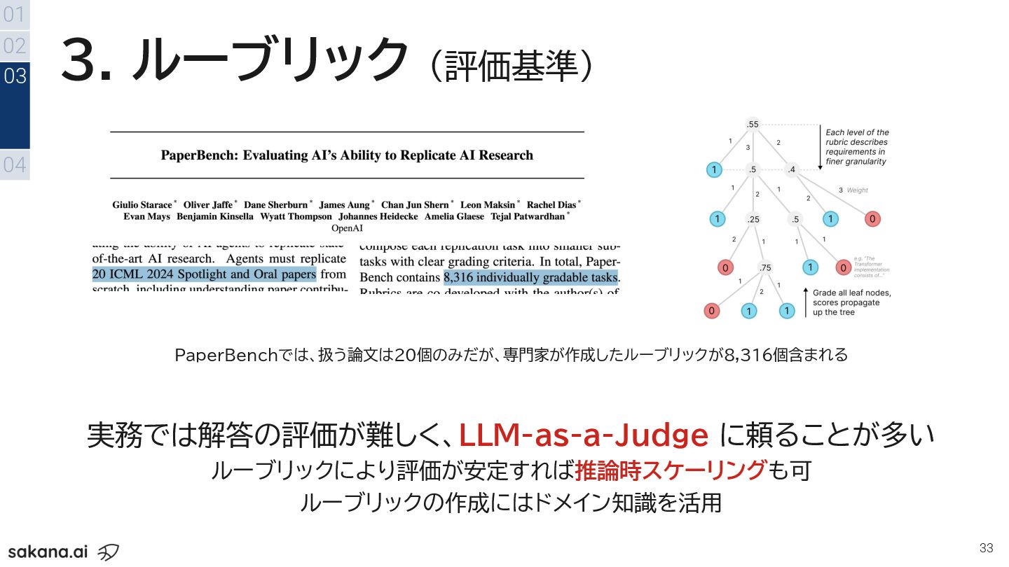 3. ルーブリック (評価基準) 33 01 02 04 03 実務では解答の評価が難しく、LLM-as-a-Judge に頼ることが多い