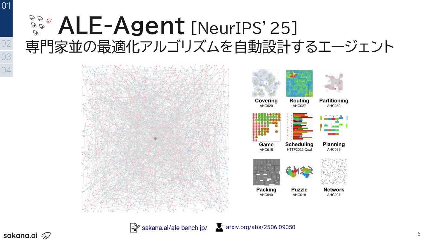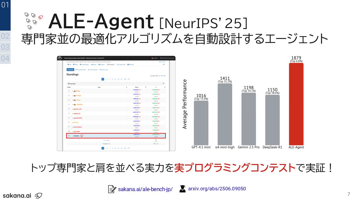 ALE-Agent [NeurIPS’25] 専門家並の最適化アルゴリズムを自動設計するエージェント 6 02 03 04 01 sakana.ai/ale-bench-jp/ arxiv.org/abs/2506.09050