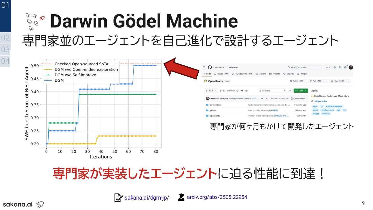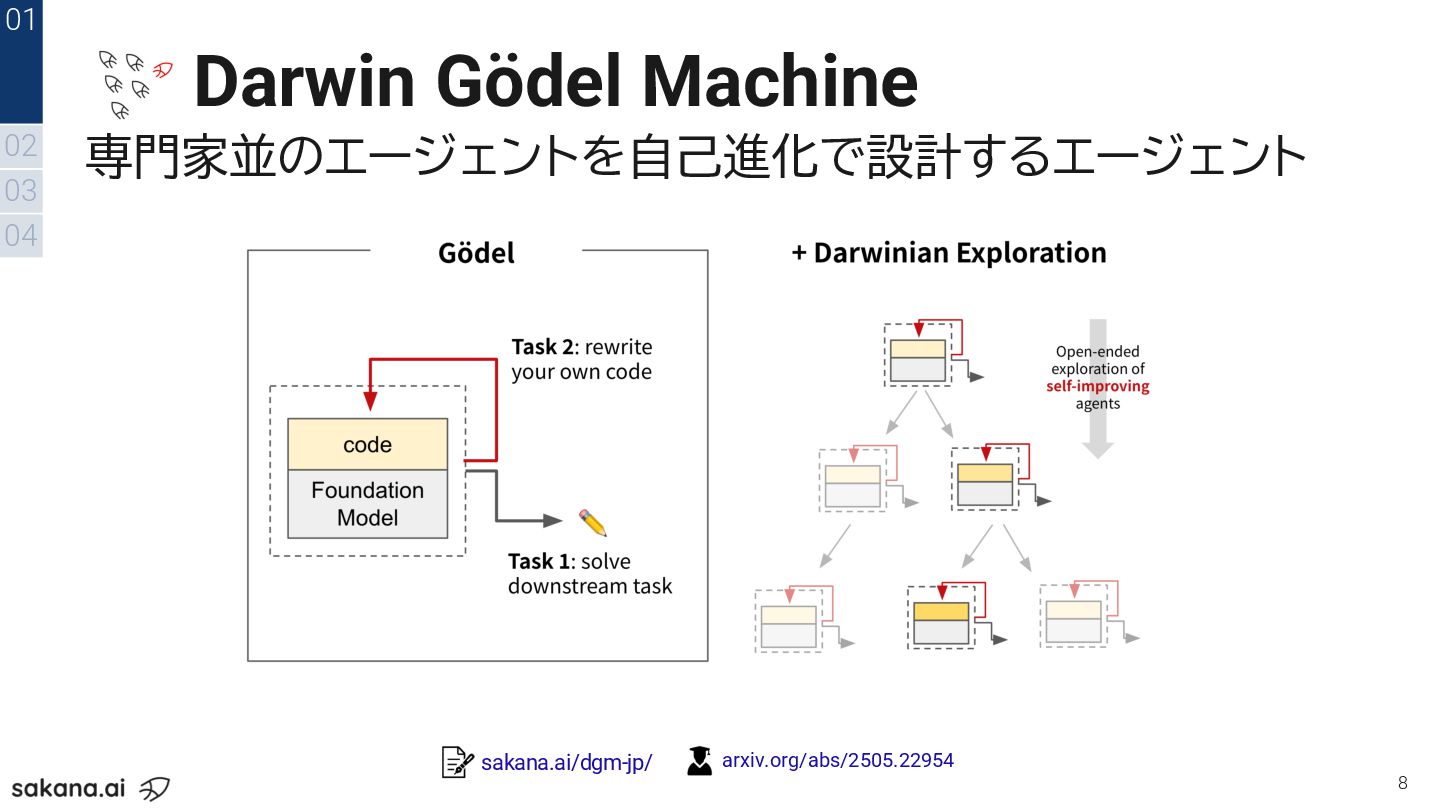 Darwin Gödel Machine 専門家並のエージェントを自己進化で設計するエージェント 8 02 03 04 01 sakana.ai/dgm-jp/ arxiv.org/abs/2505.22954