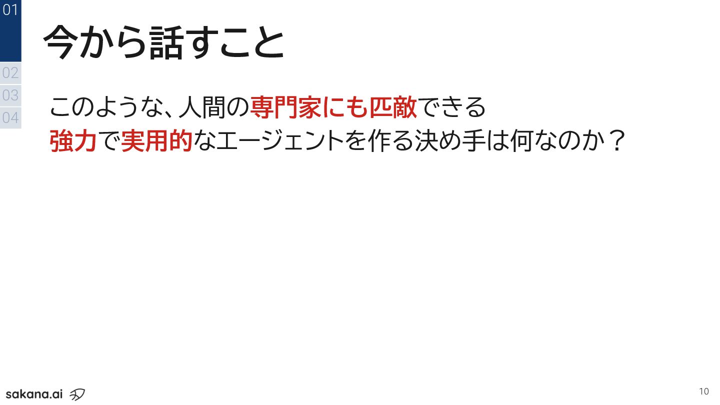 今から話すこと 10 このような、人間の専門家にも匹敵できる 強力で実用的なエージェントを作る決め手は何なのか? 02 03 04 01