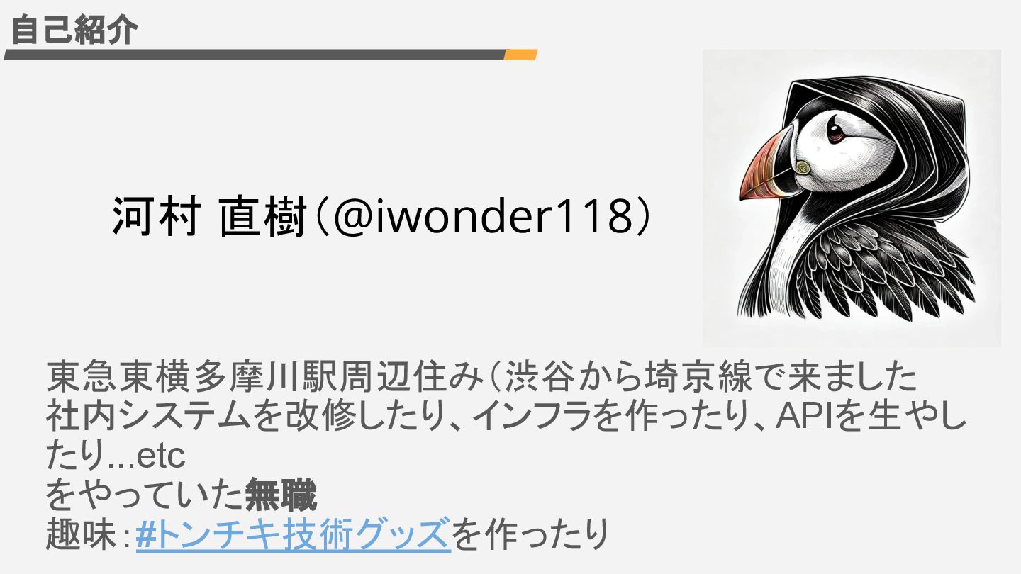 東急東横多摩川駅周辺住み(渋谷から埼京線で来ました 社内システムを改修したり、インフラを作ったり、APIを生やし たり...etc をやっていた無職 趣味:#トンチキ技術グッズを作ったり 河村 直樹(@iwonder118) 自己紹介