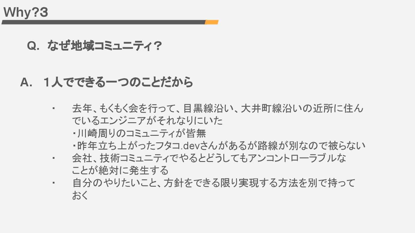 Q. なぜ地域コミュニティ? Why?3 A. 1人でできる一つのことだから ・ 去年、もくもく会を行って、目黒線沿い、大井町線沿いの近所に住ん でいるエンジニアがそれなりにいた ・川崎周りのコミュニティが皆無 ・昨年立ち上がったフタコ.devさんがあるが路線が別なので被らない