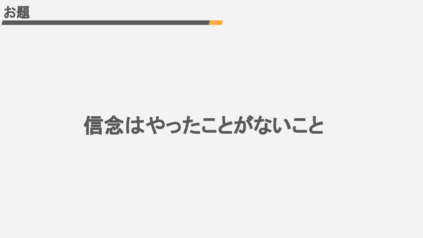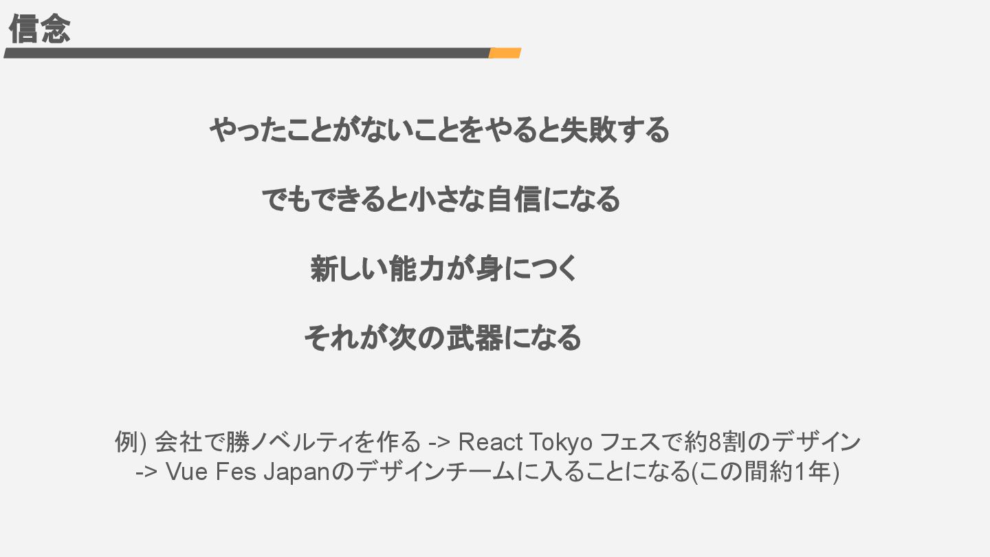 やったことがないことをやると失敗する でもできると小さな自信になる 新しい能力が身につく それが次の武器になる 信念 例) 会社で勝ノベルティを作る -> React Tokyo