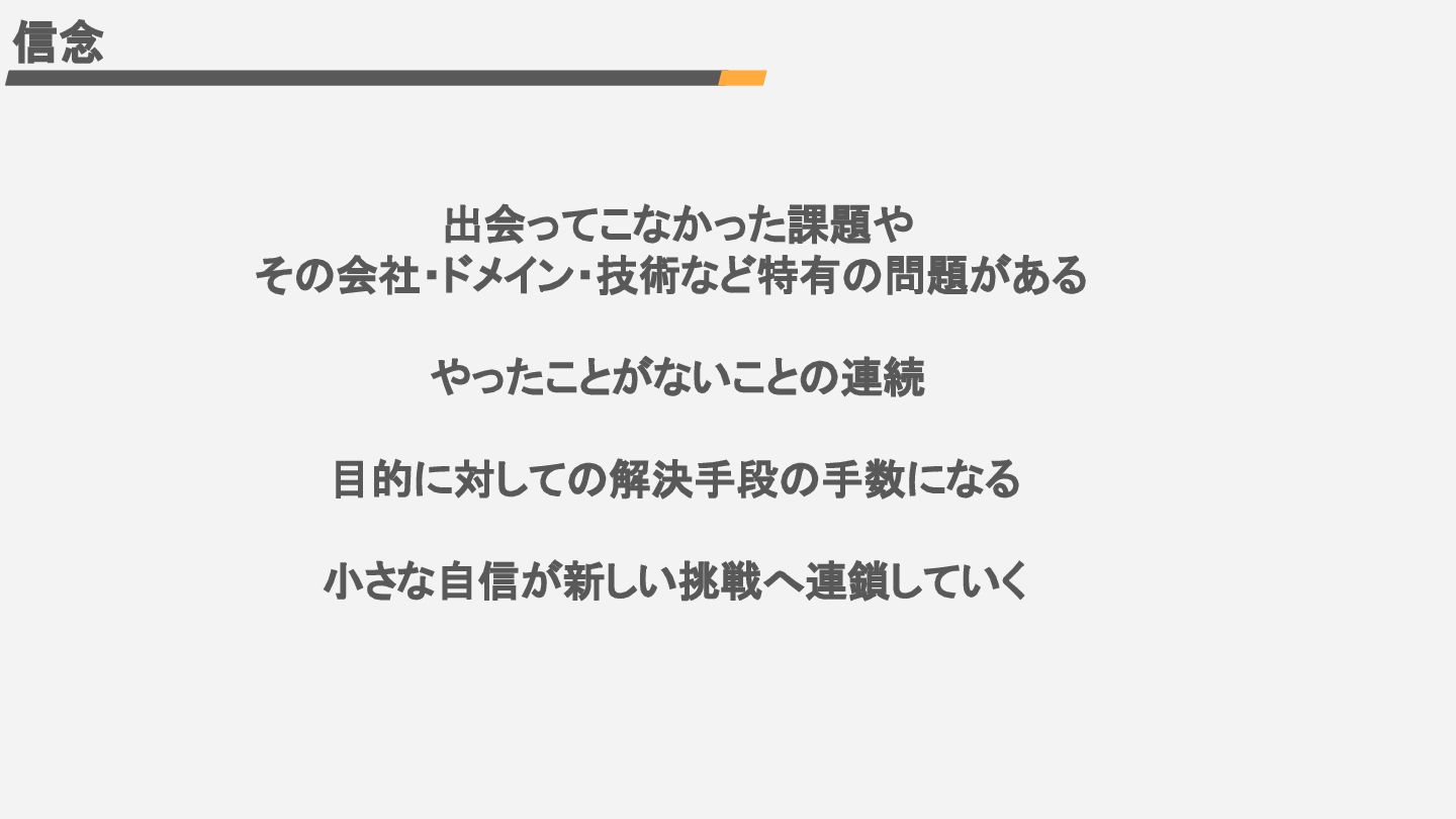 出会ってこなかった課題や その会社・ドメイン・技術など特有の問題がある やったことがないことの連続 目的に対しての解決手段の手数になる 小さな自信が新しい挑戦へ連鎖していく 信念