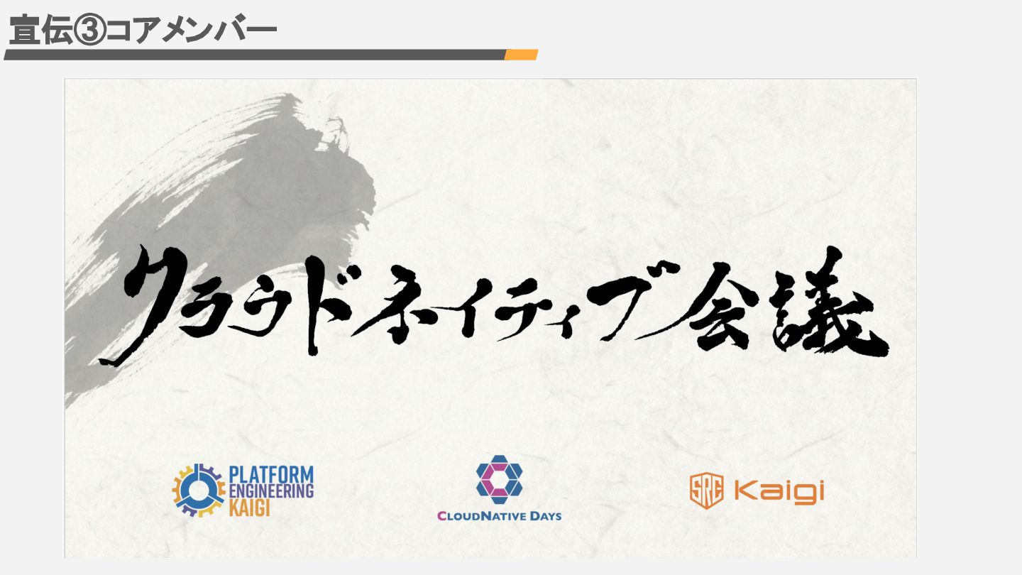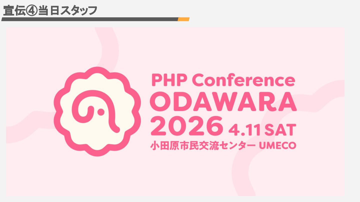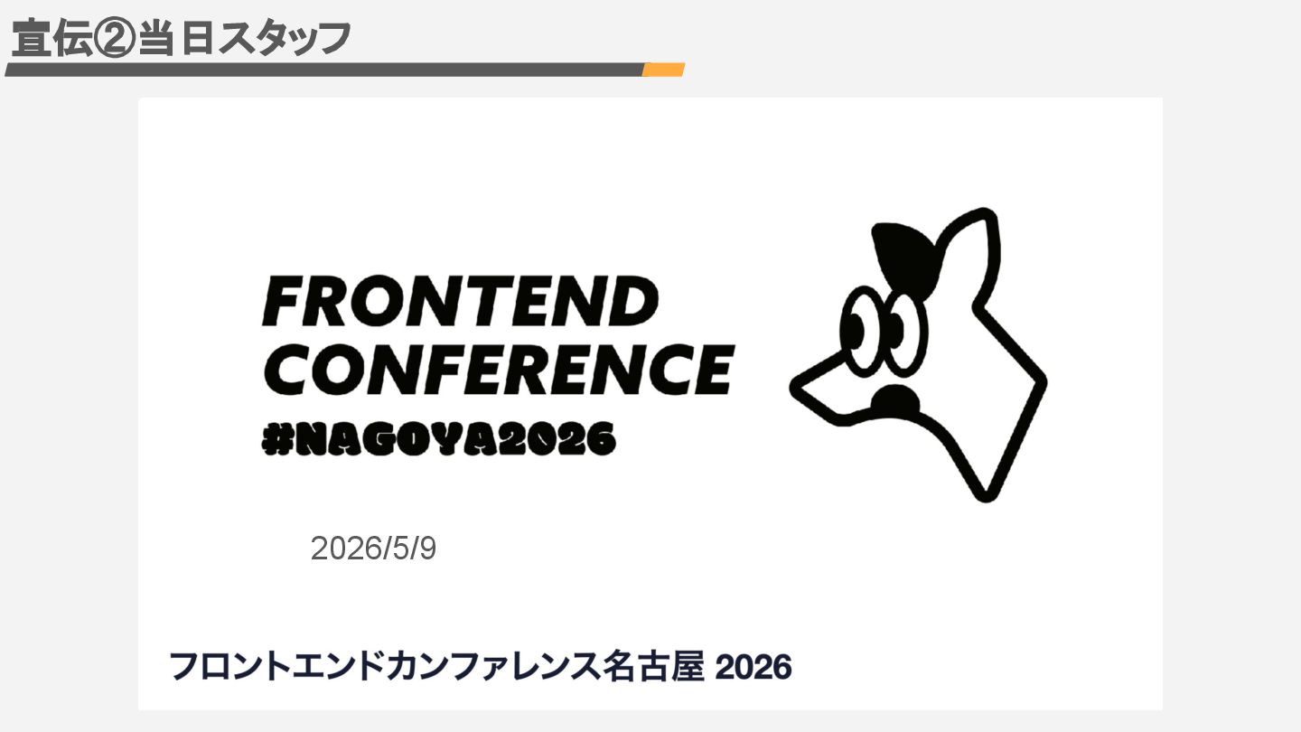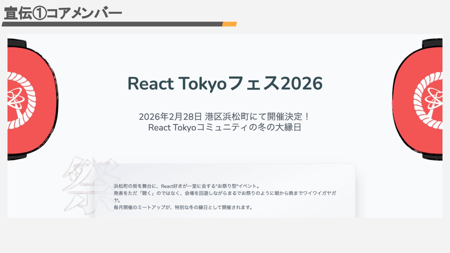 逆の立場で関わった人に提供したいと思った ・ 更にこれからの新しい人達にもコミュニティを通して、成長できる 機会を提供したい スタッフ予定 React Tokyo / Vue Fes Japan / クラウドネイティブ会議 / フロントエンドカンファレンス名古屋/ PHP カンファレンス小田原/ PHPカンファレンス 新潟