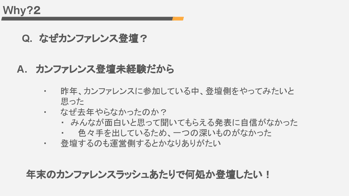 Q. なぜカンファレンス登壇? Why?2 A. カンファレンス登壇未経験だから ・ 昨年、カンファレンスに参加している中、登壇側をやってみたいと 思った ・ なぜ去年やらなかったのか?