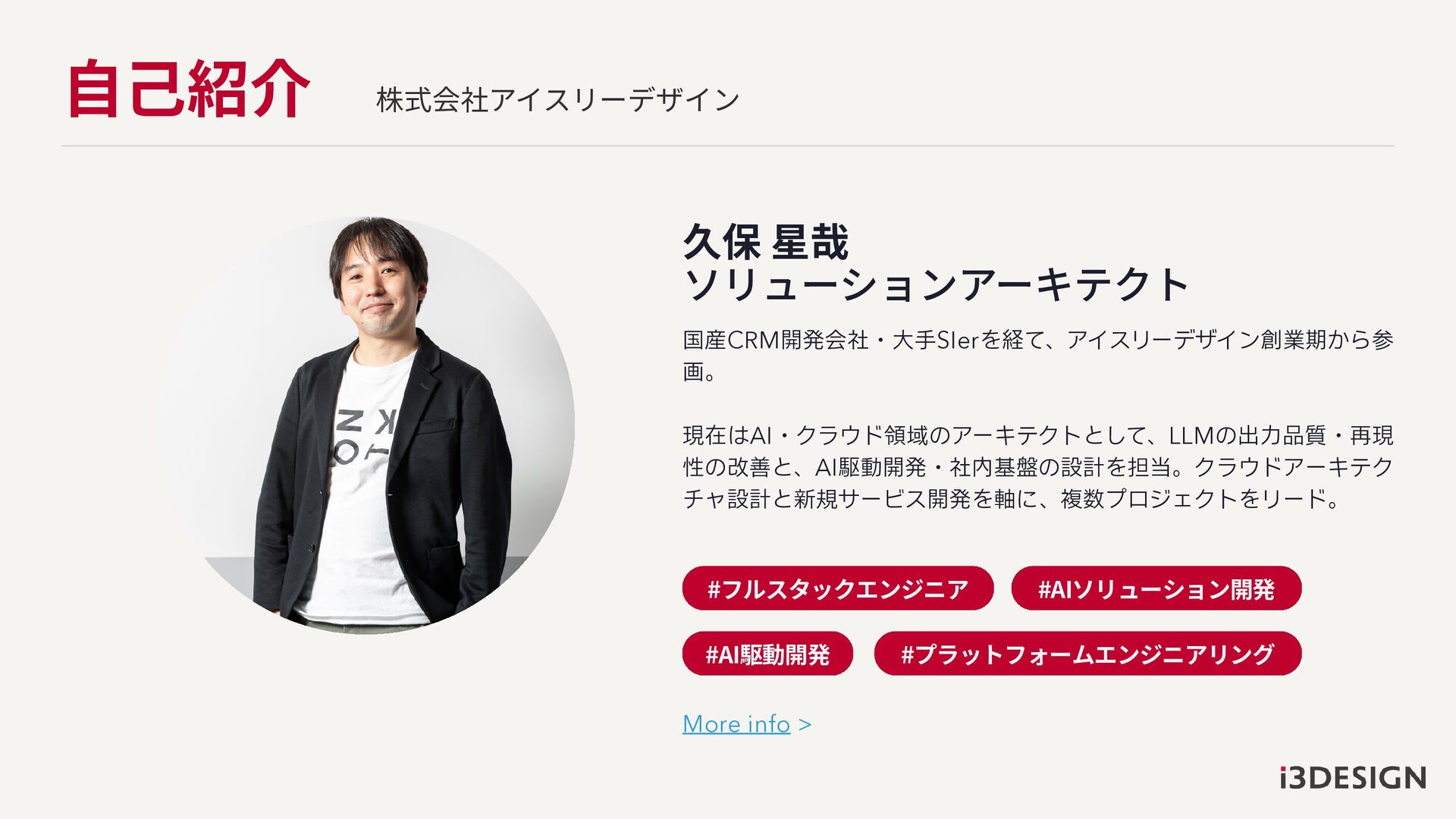 自⼰紹介 株式会社アイスリーデザイン 国産CRM開発会社・大手SIerを経て、アイスリーデザイン創業期から参 画。 現在はAI・クラウド領域のアーキテクトとして、LLMの出力品質・再現 性の改善と、AI駆動開発・社内基盤の設計を担当。クラウドアーキテク チャ設計と新規サービス開発を軸に、複数プロジェクトをリード。 久保 星哉 ソリューションアーキテクト