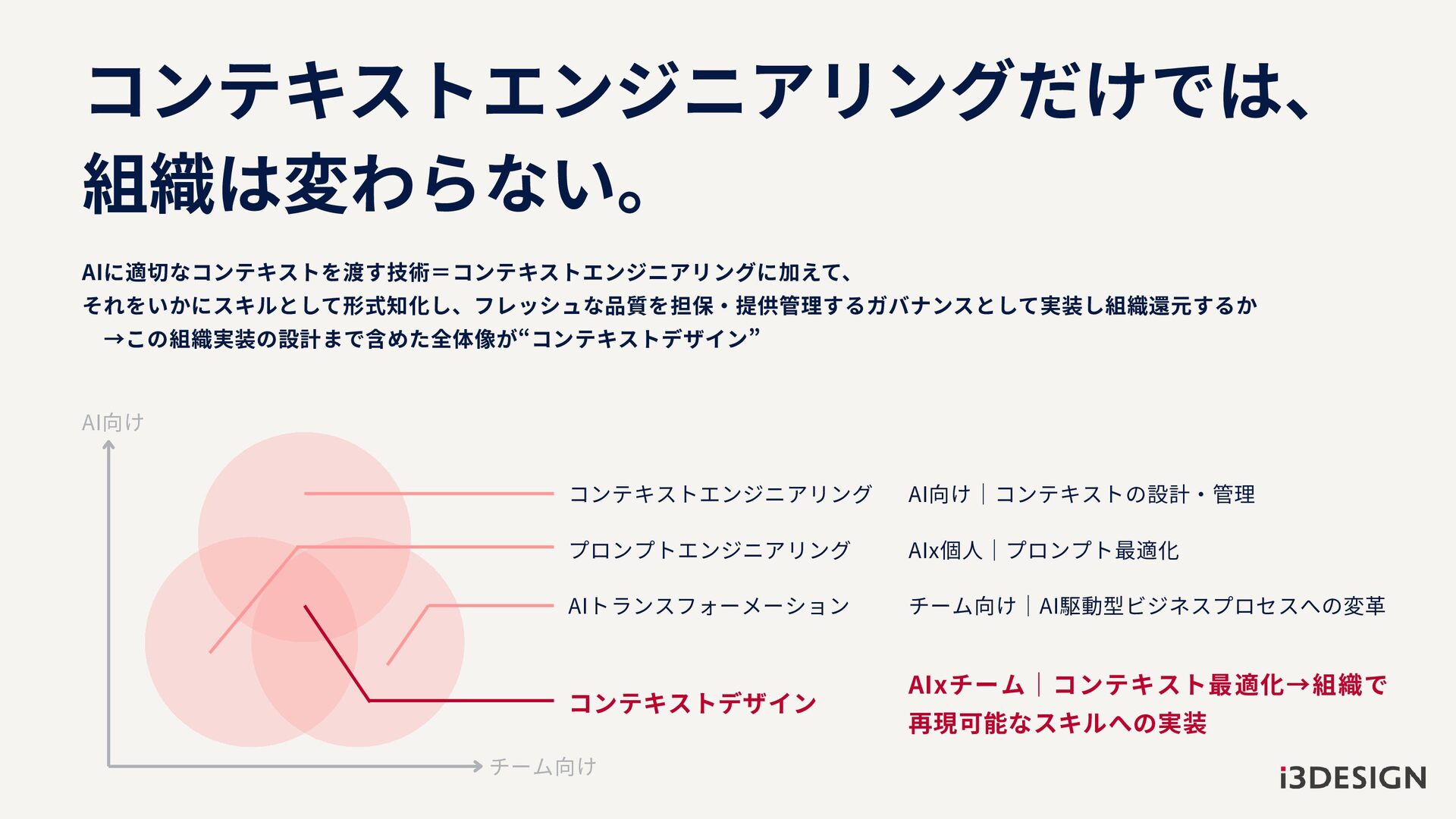コンテキストエンジニアリングだけでは、 組織は変わらない。 AIに適切なコンテキストを渡す技術=コンテキストエンジニアリングに加えて、 それをいかにスキルとして形式知化し、フレッシュな品質を担保・提供管理するガバナンスとして実装し組織還元するか →この組織実装の設計まで含めた全体像が“コンテキストデザイン” コンテキストエンジニアリング プロンプトエンジニアリング AIトランスフォーメーション AI向け チーム向け