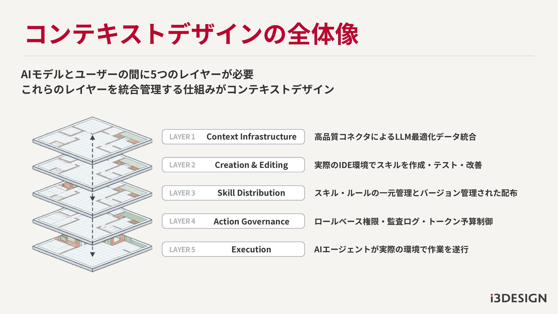 コンテキストデザインの全体像 AIモデルとユーザーの間に5つのレイヤーが必要 これらのレイヤーを統合管理する仕組みがコンテキストデザイン 高品質コネクタによるLLM最適化データ統合 実際のIDE環境でスキルを作成・テスト・改善 スキル・ルールの一元管理とバージョン管理された配布 ロールベース権限・監査ログ・トークン予算制御 AIエージェントが実際の環境で作業を遂行 LAYER 1