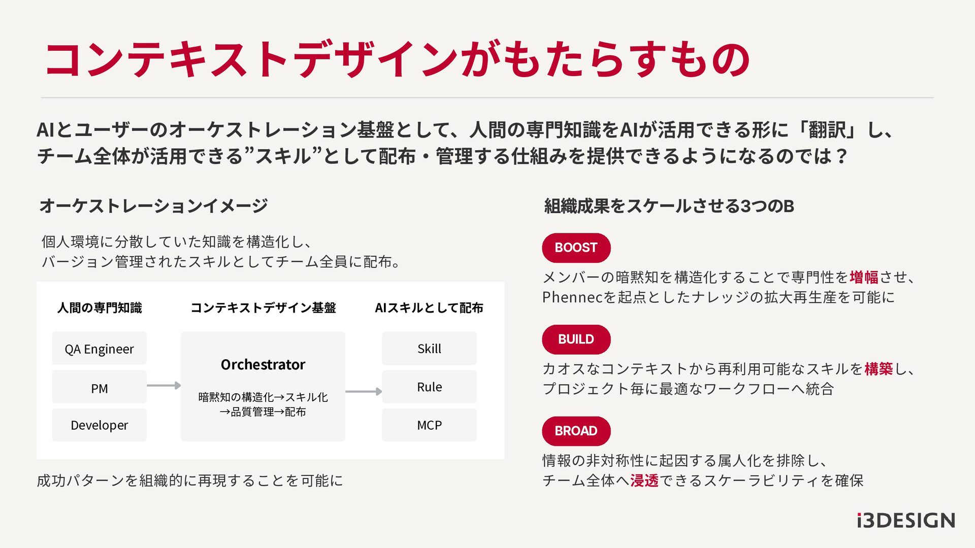 Code、Antigravity、Cursorなど AIエージェント活用が非エンジニア領域にも浸透。 AIによる価値創出が民主化されたことで 全員が活用できることが組織的な競争力の源泉に 02 コンテキストデータの爆発的増加 組織が扱うコンテキストデータは約4年で2倍*に増加 し、情報処理の主体は人間からAIへ。 コンテキスト限界・汚染を想定し、AIが効果的・効率 的に扱える基盤設計が急務 *IDC Global DataSphere推計 03 ツールごとの個別統合 コピペベースの手動運用 安定しないAIの出力品質 個人のスキル差が成果に直結 大量情報のメンテナンス負荷 認知負荷によるパフォーマンス低下 AIエージェント向け モジュールの構築 専門知識・暗黙知の 標準スキル開発・流通 AIに最適化された コンテキスト設計