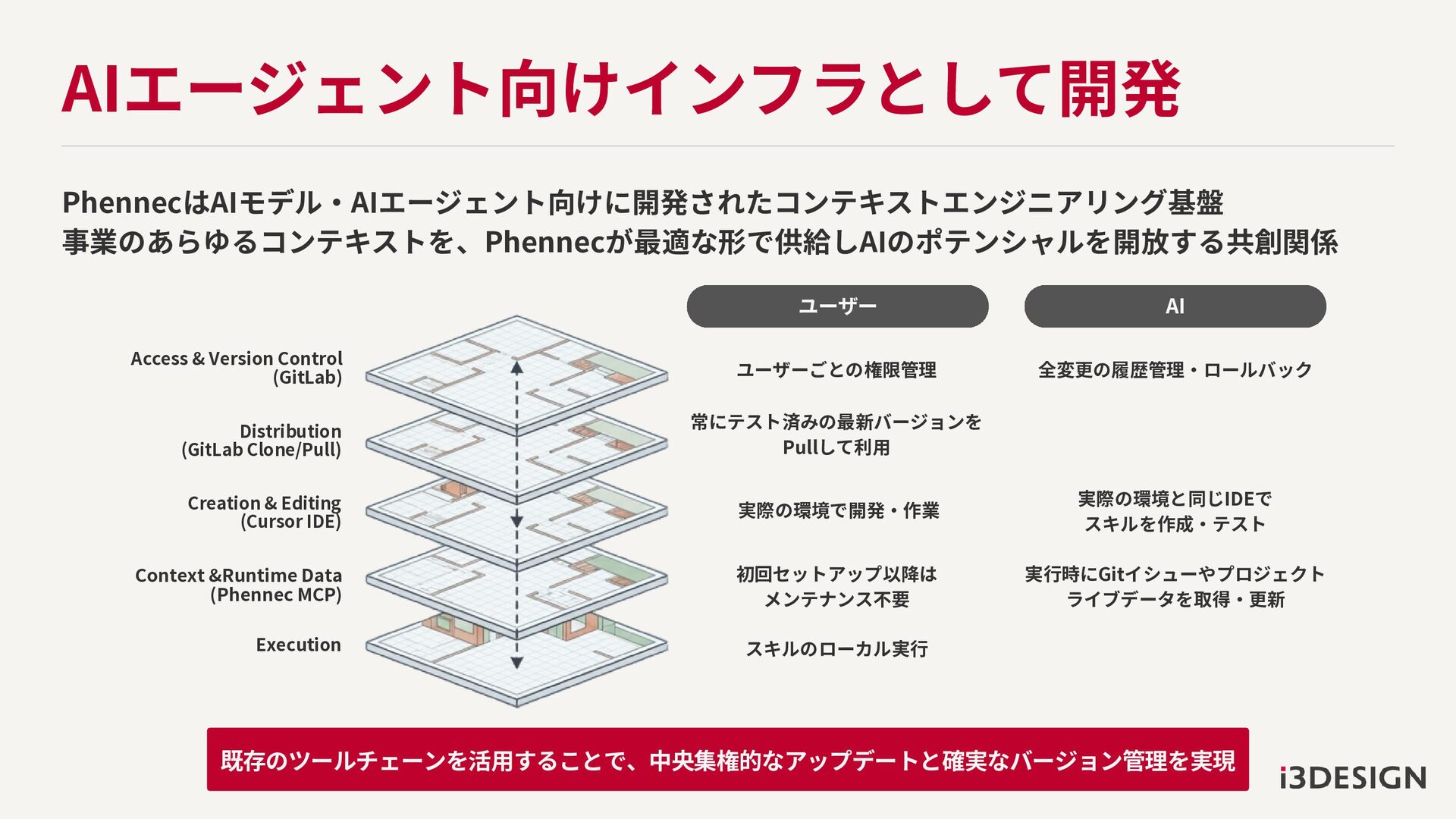 AIエージェント向けインフラとして開発 PhennecはAIモデル・AIエージェント向けに開発されたコンテキストエンジニアリング基盤 事業のあらゆるコンテキストを、Phennecが最適な形で供給しAIのポテンシャルを開放する共創関係 ユーザー AI ユーザーごとの権限管理 全変更の履歴管理・ロールバック 常にテスト済みの最新バージョンを Pullして利用 実際の環境と同じIDEで