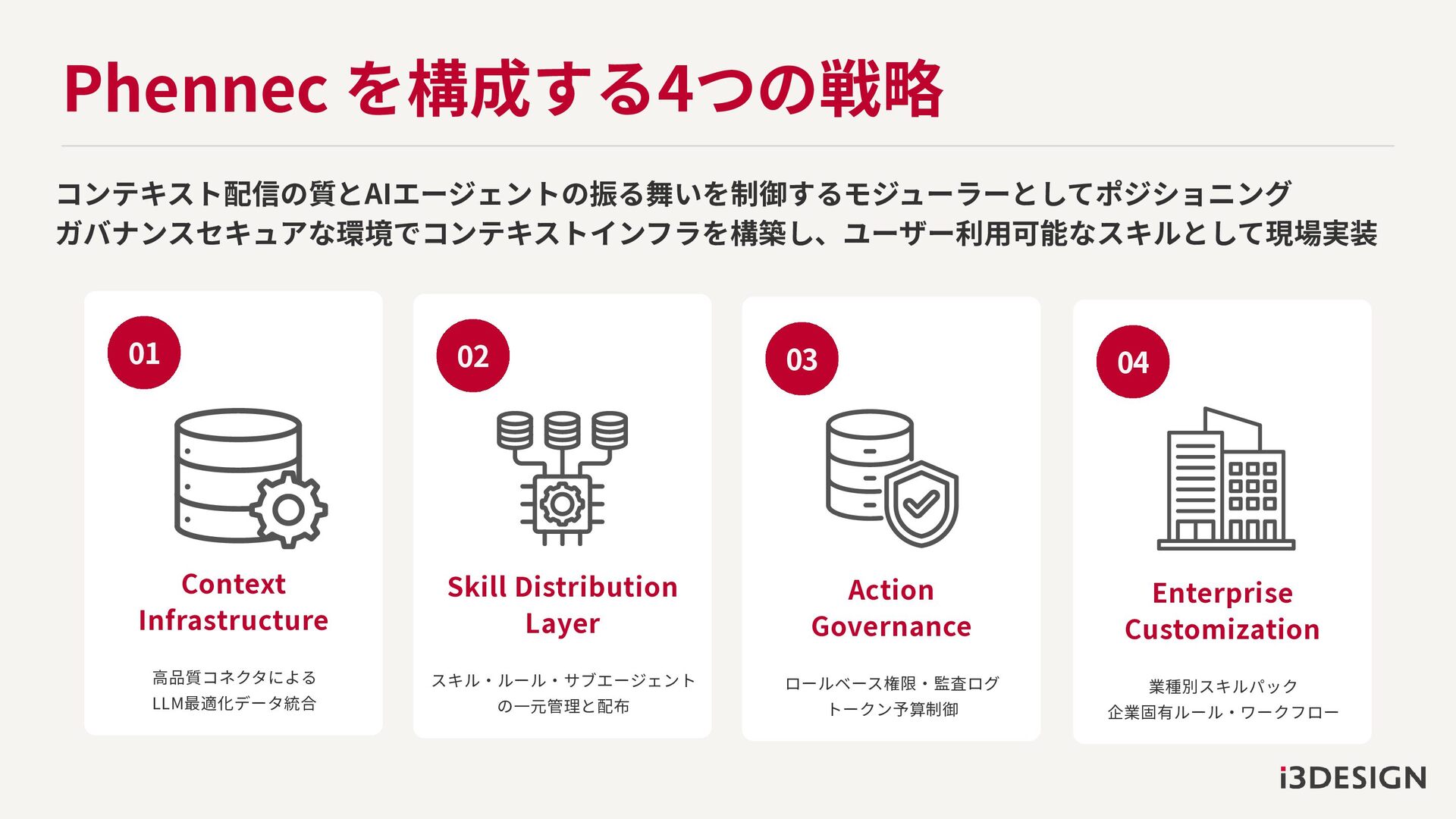 Phennec を構成する4つの戦略 コンテキスト配信の質とAIエージェントの振る舞いを制御するモジューラーとしてポジショニング ガバナンスセキュアな環境でコンテキストインフラを構築し、ユーザー利用可能なスキルとして現場実装 Context Infrastructure 高品質コネクタによる LLM最適化データ統合 01 Skill