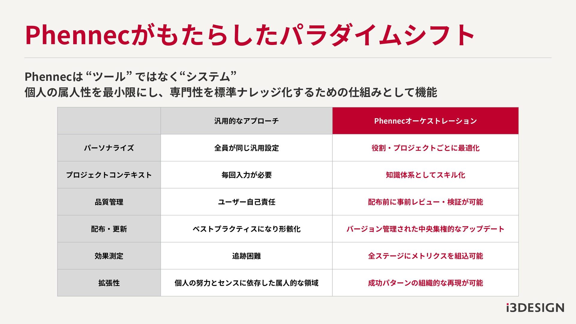 Phennecがもたらしたパラダイムシフト Phennecは “ツール” ではなく“システム” 個人の属人性を最小限にし、専門性を標準ナレッジ化するための仕組みとして機能 汎用的なアプローチ Phennecオーケストレーション パーソナライズ 全員が同じ汎用設定 役割・プロジェクトごとに最適化