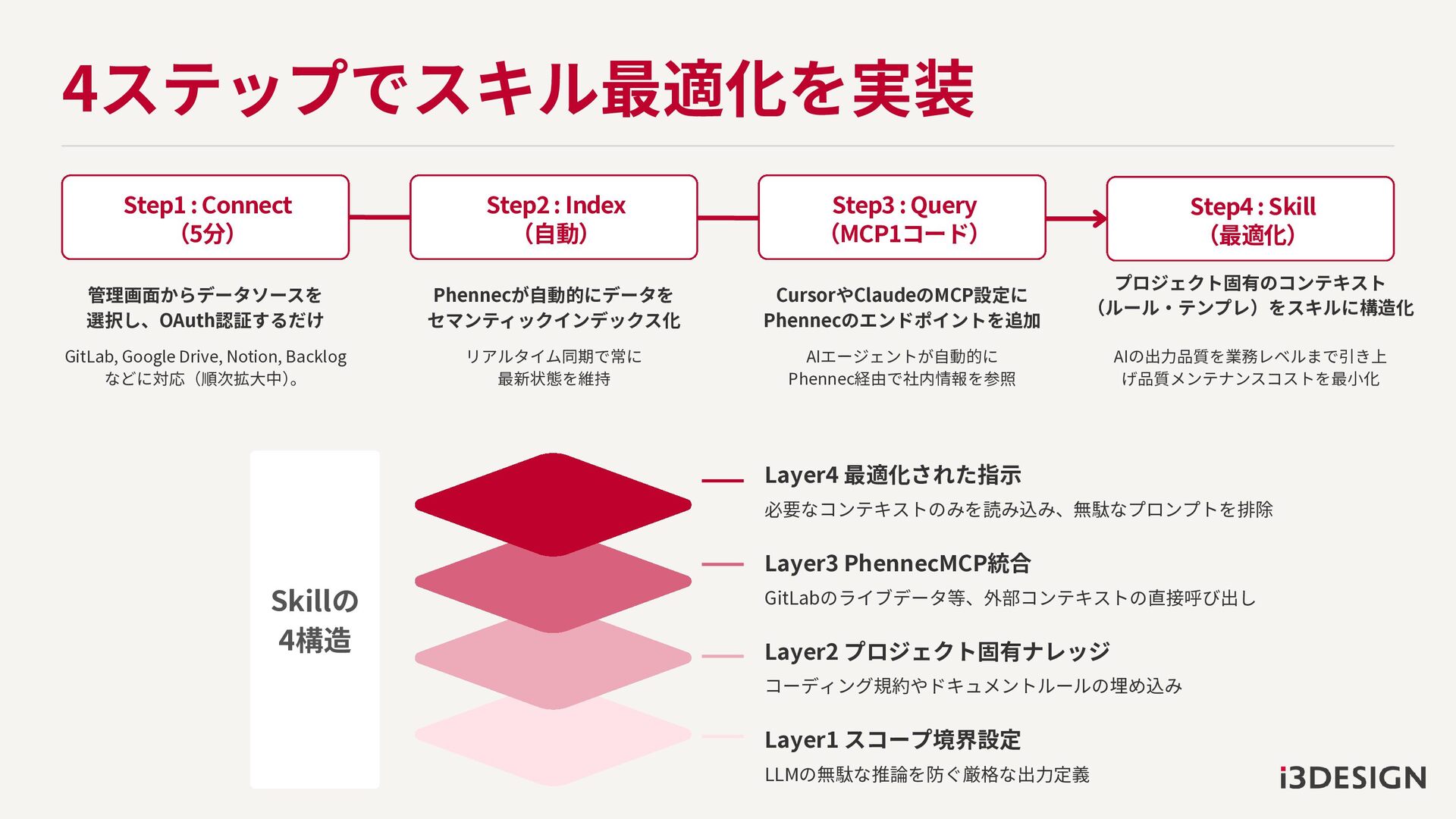Index (自動) Step3 : Query (MCP1コード) Layer4 最適化された指示 必要なコンテキストのみを読み込み、無駄なプロンプトを排除 Layer3 PhennecMCP統合 GitLabのライブデータ等、外部コンテキストの直接呼び出し Layer2 プロジェクト固有ナレッジ コーディング規約やドキュメントルールの埋め込み Layer1 スコープ境界設定 LLMの無駄な推論を防ぐ厳格な出力定義 4ステップでスキル最適化を実装 管理画面からデータソースを 選択し、OAuth認証するだけ Phennecが自動的にデータを セマンティックインデックス化 CursorやClaudeのMCP設定に Phennecのエンドポイントを追加 プロジェクト固有のコンテキスト (ルール・テンプレ)をスキルに構造化 GitLab, Google Drive, Notion, Backlog などに対応(順次拡大中) 。 リアルタイム同期で常に 最新状態を維持 AIエージェントが自動的に Phennec経由で社内情報を参照 AIの出力品質を業務レベルまで引き上 げ品質メンテナンスコストを最小化 Skillの 4構造