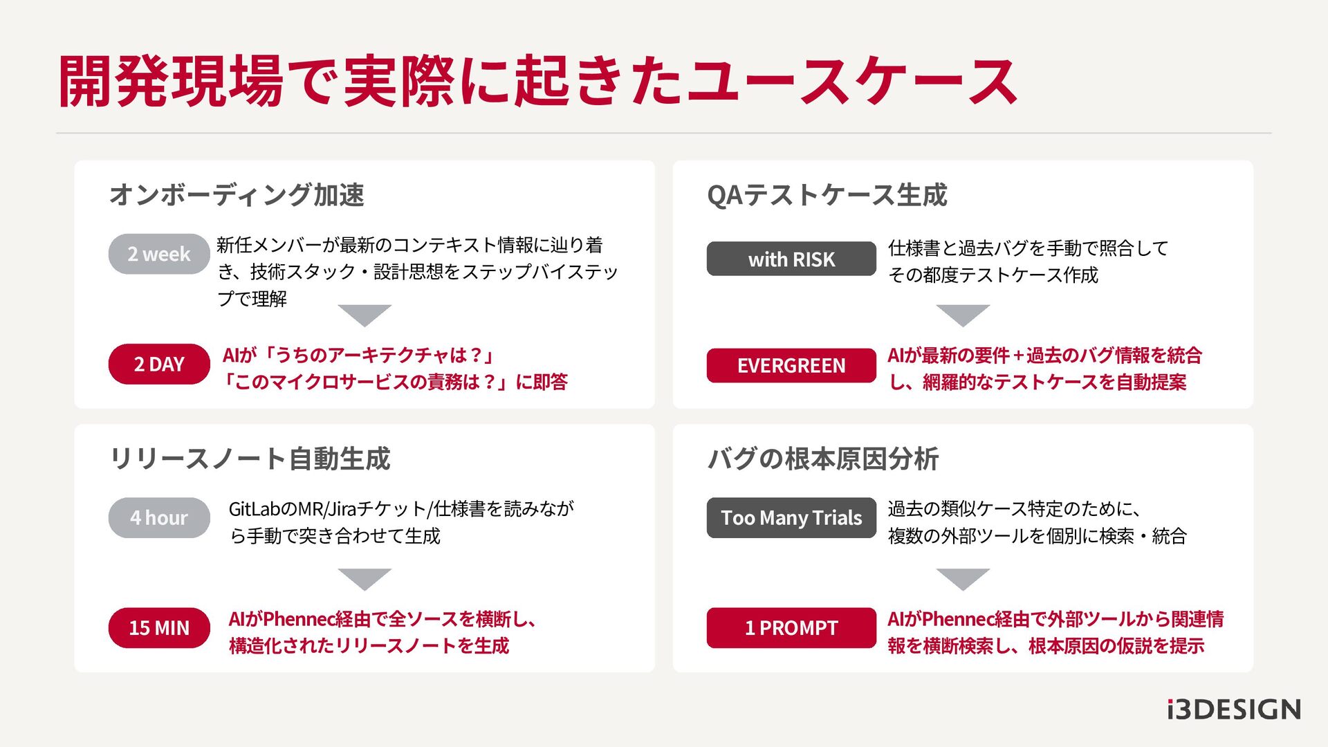 DAY リリースノート自動生成 AIがPhennec経由で全ソースを横断し、 構造化されたリリースノートを生成 GitLabのMR/Jiraチケット/仕様書を読みなが ら手動で突き合わせて生成 4 hour 15 MIN バグの根本原因分析 AIがPhennec経由で外部ツールから関連情 報を横断検索し、根本原因の仮説を提示 過去の類似ケース特定のために、 複数の外部ツールを個別に検索・統合 Too Many Trials 1 PROMPT QAテストケース生成 AIが最新の要件 + 過去のバグ情報を統合 し、網羅的なテストケースを自動提案 仕様書と過去バグを手動で照合して その都度テストケース作成 with RISK EVERGREEN