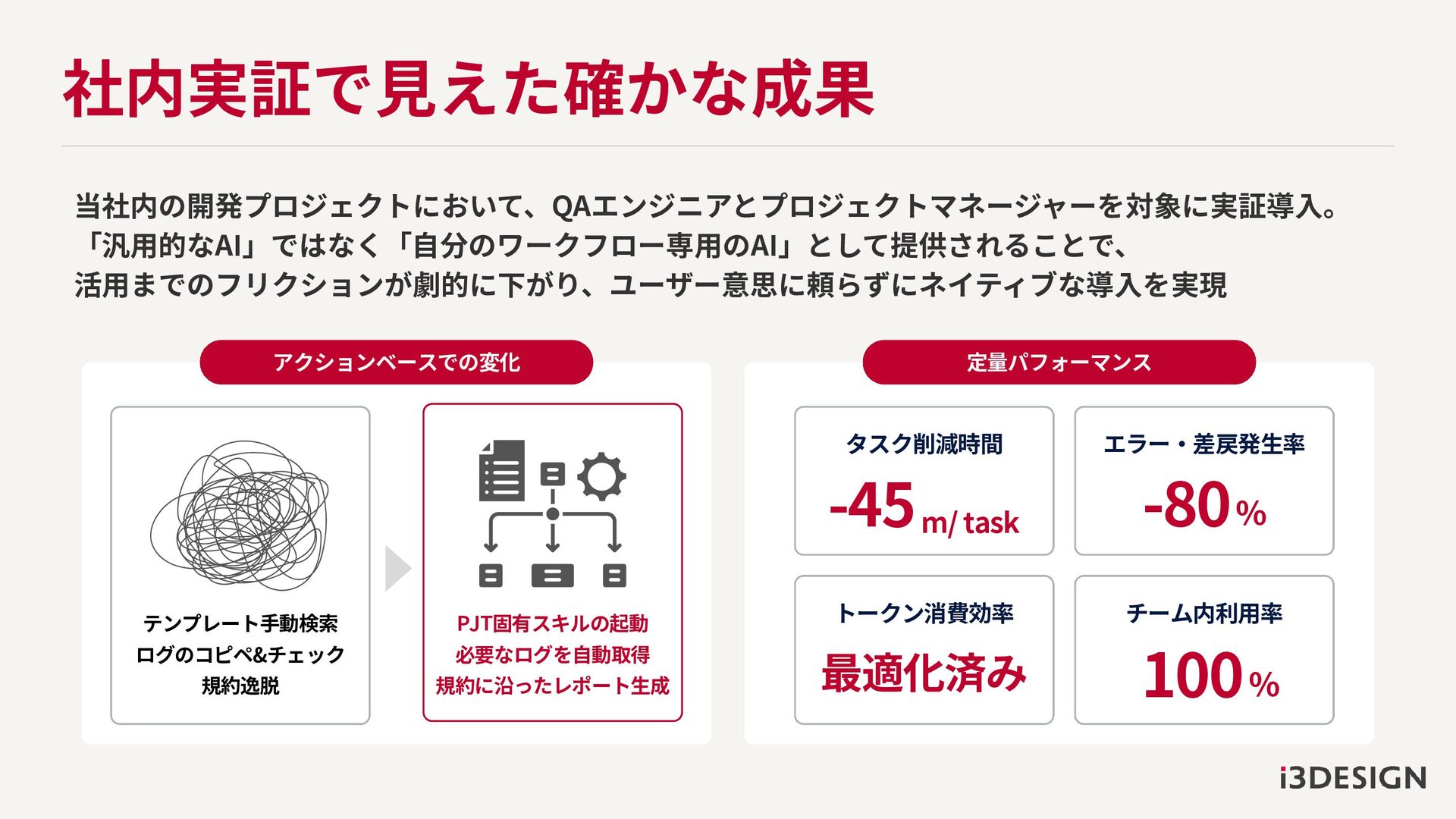 社内実証で見えた確かな成果 当社内の開発プロジェクトにおいて、QAエンジニアとプロジェクトマネージャーを対象に実証導入。 「汎用的なAI」ではなく「自分のワークフロー専用のAI」として提供されることで、 活用までのフリクションが劇的に下がり、ユーザー意思に頼らずにネイティブな導入を実現 定量パフォーマンス タスク削減時間 -45m/ task トークン消費効率 最適化済み
