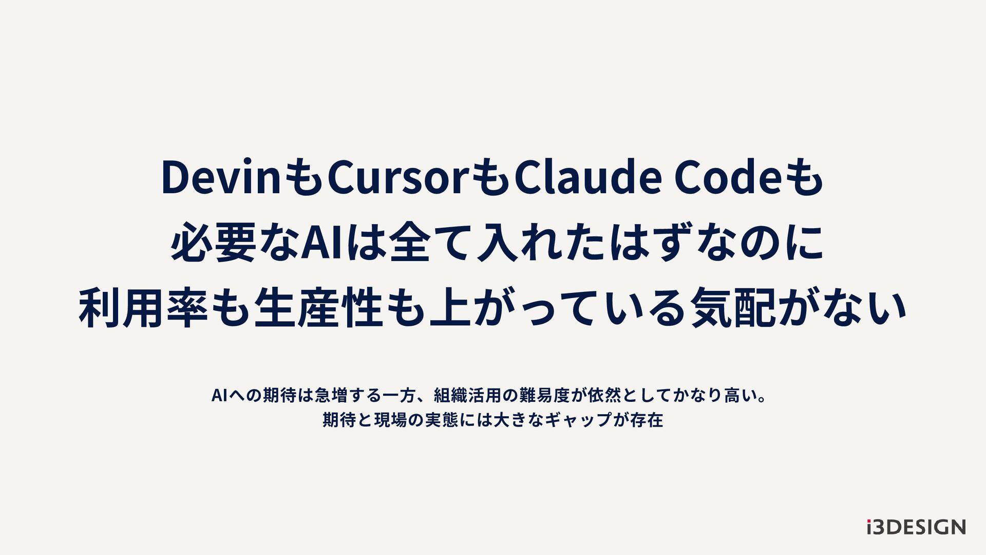 DevinもCursorもClaude Codeも 必要なAIは全て入れたはずなのに 利用率も生産性も上がっている気配がない AIへの期待は急増する一方、組織活用の難易度が依然としてかなり高い。 期待と現場の実態には大きなギャップが存在