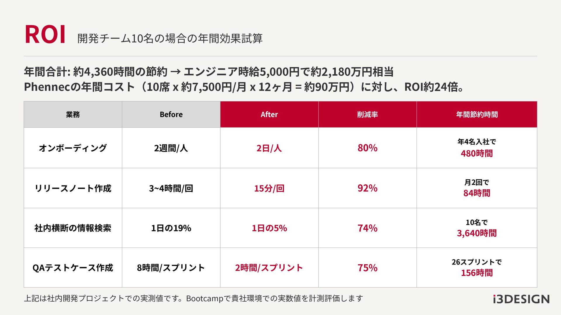 12ヶ月 = 約90万円)に対し、ROI約24倍。 上記は社内開発プロジェクトでの実測値です。Bootcampで貴社環境での実数値を計測評価します 業務 Before After 削減率 年間節約時間 オンボーディング 2週間/人 2日/人 80% 年4名入社で 480時間 リリースノート作成 3~4時間/回 15分/回 92% 月2回で 84時間 社内横断の情報検索 1日の19% 1日の5% 74% 10名で 3,640時間 QAテストケース作成 8時間/スプリント 2時間/スプリント 75% 26スプリントで 156時間