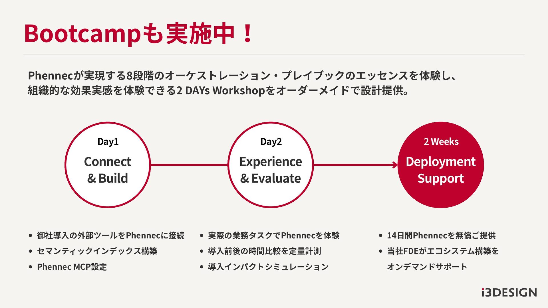 セマンティックインデックス構築 Phennec MCP設定 実際の業務タスクでPhennecを体験 導入前後の時間比較を定量計測 導入インパクトシミュレーション 2 Weeks Deployment Support 14日間Phennecを無償ご提供 当社FDEがエコシステム構築を オンデマンドサポート Day2 Experience & Evaluate