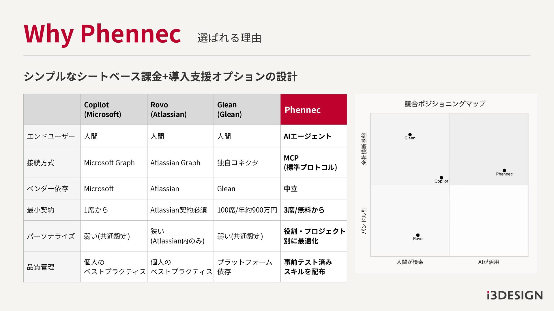Why Phennec 選ばれる理由 Copilot (Microsoft) Rovo (Atlassian) Glean (Glean) Phennec