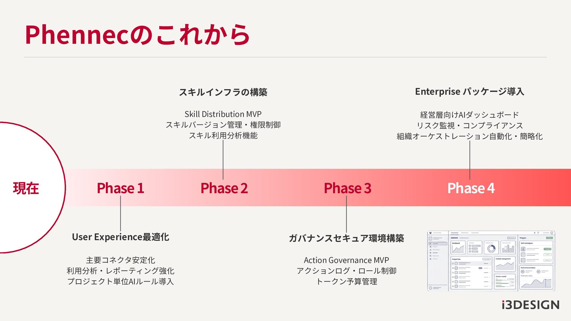 Phennecのこれから 現在 Enterprise パッケージ導入 経営層向けAIダッシュボード リスク監視・コンプライアンス 組織オーケストレーション自動化・簡略化 Phase 3 Phase