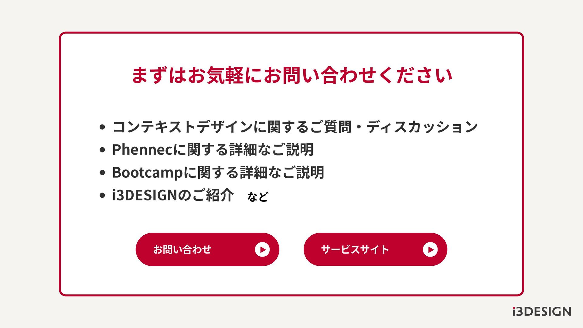 コンテキストデザインに関するご質問・ディスカッション Phennecに関する詳細なご説明 Bootcampに関する詳細なご説明 i3DESIGNのご紹介 お問い合わせ サービスサイト まずはお気軽にお問い合わせください など