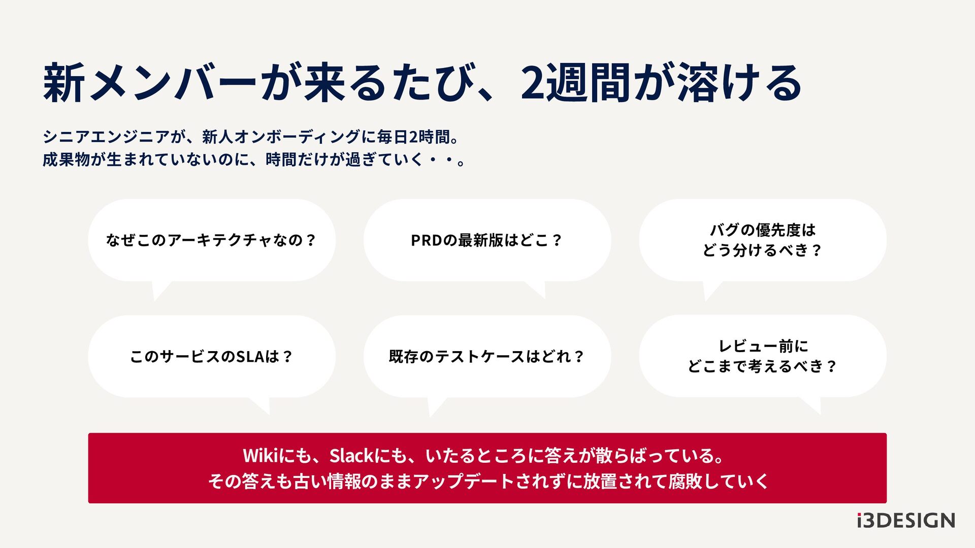 Wikiにも、Slackにも、いたるところに答えが散らばっている。 その答えも古い情報のままアップデートされずに放置されて腐敗していく なぜこのアーキテクチャなの? バグの優先度は どう分けるべき? 既存のテストケースはどれ? PRDの最新版はどこ? このサービスのSLAは? レビュー前に どこまで考えるべき?