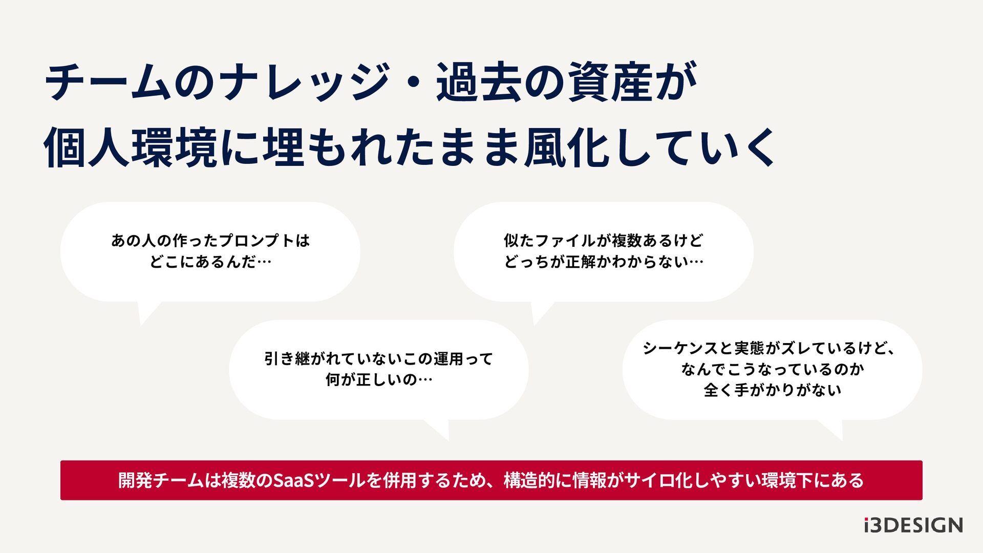 開発チームは複数のSaaSツールを併用するため、構造的に情報がサイロ化しやすい環境下にある チームのナレッジ・過去の資産が 個人環境に埋もれたまま風化していく あの人の作ったプロンプトは どこにあるんだ… 似たファイルが複数あるけど どっちが正解かわからない… 引き継がれていないこの運用って 何が正しいの… シーケンスと実態がズレているけど、