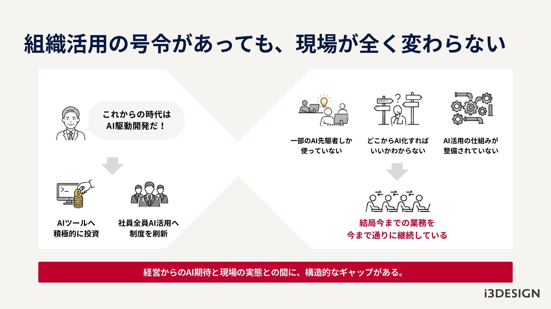 経営からのAI期待と現場の実態との間に、構造的なギャップがある。 これからの時代は AI駆動開発だ! AIツールへ 積極的に投資 組織活用の号令があっても、現場が全く変わらない 社員全員AI活用へ 制度を刷新 一部のAI先駆者しか 使っていない