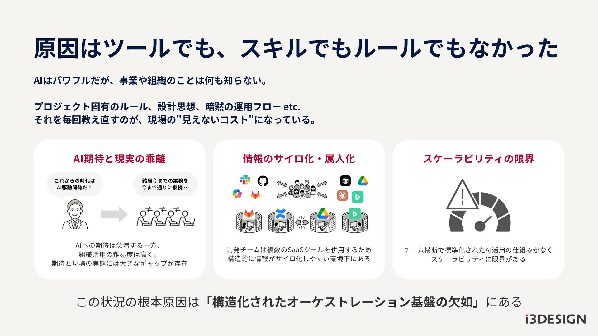AIへの期待は急増する一方、 組織活用の難易度は高く、 期待と現場の実態には大きなギャップが存在 開発チームは複数のSaaSツールを併用するため 構造的に情報がサイロ化しやすい環境下にある チーム横断で標準化されたAI活用の仕組みがなく スケーラビリティに限界がある 情報のサイロ化・属人化 AI期待と現実の乖離 スケーラビリティの限界 原因はツールでも、スキルでもルールでもなかった