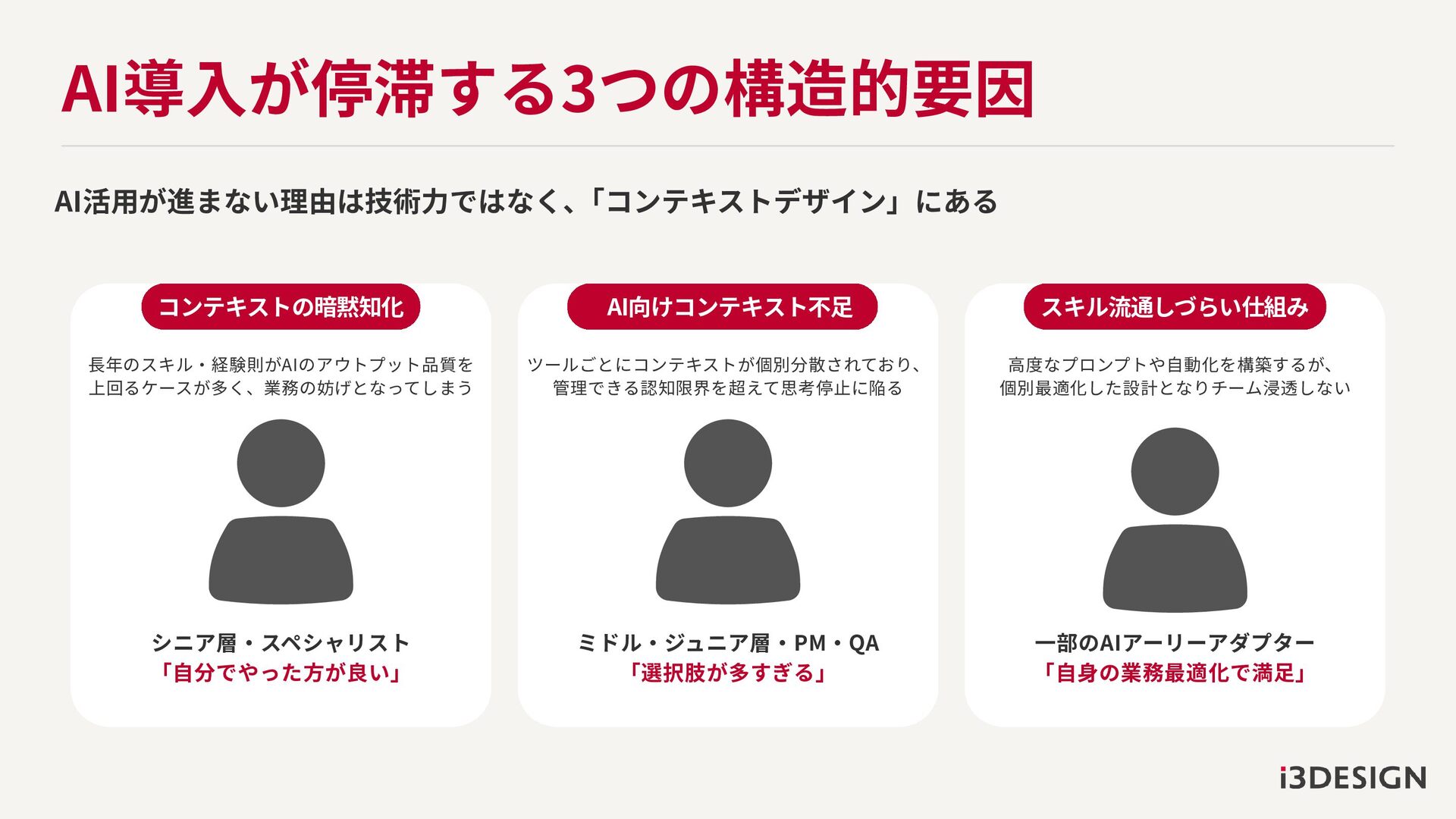 AI導入が停滞する3つの構造的要因 AI活用が進まない理由は技術力ではなく、 「コンテキストデザイン」にある シニア層・スペシャリスト 「自分でやった方が良い」 長年のスキル・経験則がAIのアウトプット品質を 上回るケースが多く、業務の妨げとなってしまう ミドル・ジュニア層・PM・QA 「選択肢が多すぎる」 ツールごとにコンテキストが個別分散されており、