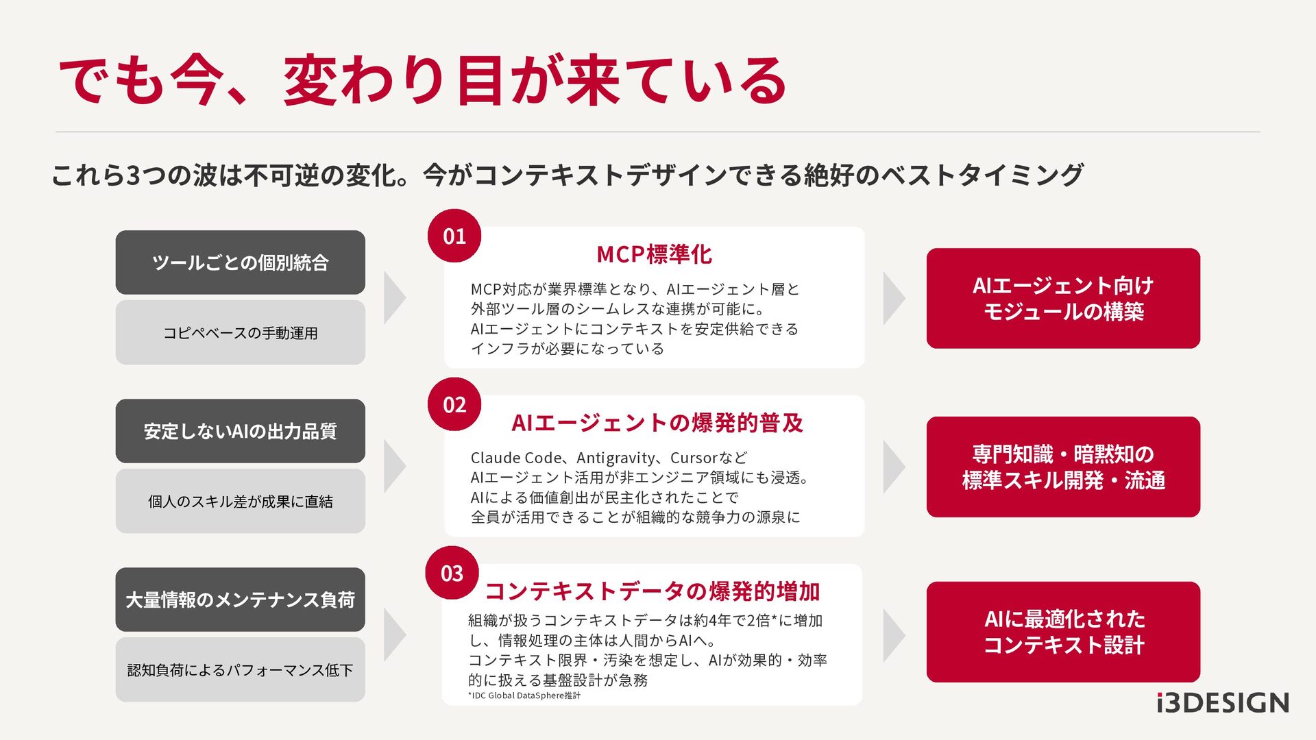 でも今、変わり目が来ている これら3つの波は不可逆の変化。今がコンテキストデザインできる絶好のベストタイミング MCP標準化 MCP対応が業界標準となり、AIエージェント層と 外部ツール層のシームレスな連携が可能に。 AIエージェントにコンテキストを安定供給できる インフラが必要になっている 01 AIエージェントの爆発的普及 Claude