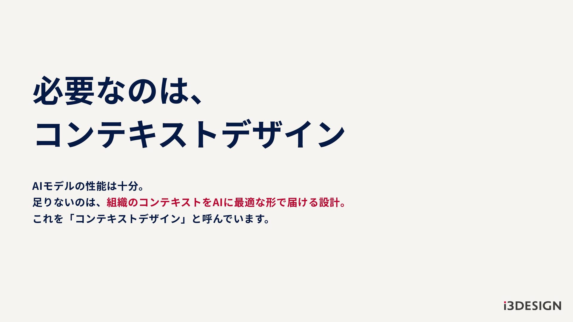 必要なのは、 コンテキストデザイン AIモデルの性能は十分。 足りないのは、組織のコンテキストをAIに最適な形で届ける設計。 これを「コンテキストデザイン」と呼んでいます。