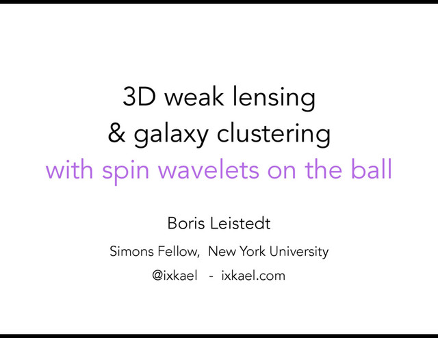 defined radial & angular scales ‣ probe N complementary orientations about ‣ achieve exact reconstruction & multi resolution in harmonic space thanks to sampling theorem Leistedt & McEwen (IEEE, 2012) (✓, ) sWs ij (✓, , , r) ⌘ sf ? s ij = hsf|R(✓, , )s iji s ij Leistedt, McEwen, Kitching & Peiris (PRD, 2015) hsf|R(✓, , ) Trs iji