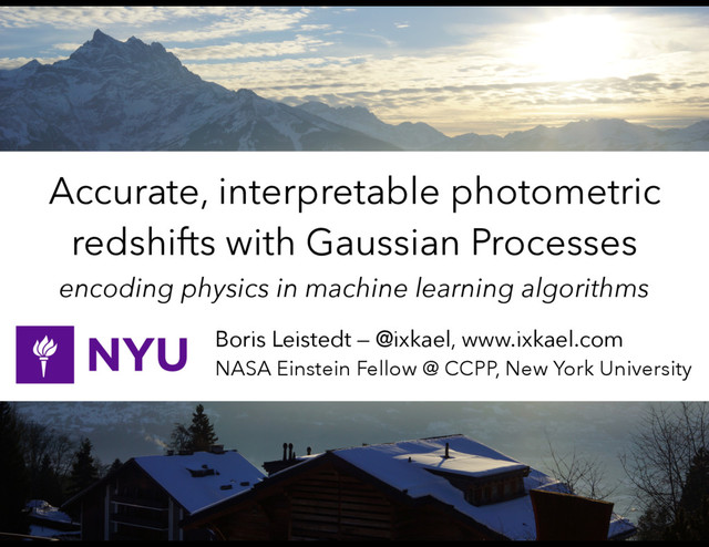 for pairwise comparison with target galaxies = machine learning + template fitting Probabilistic, physical, and data driven Interpretable model & PDFs. Flexibility via parameters. Use much more data than existing methods: heterogeneous combination of spectroscopic or deeper photometric data Fast to (re-)train/apply. No need to store tabulated PDFs. NEW METHOD: DELIGHTTM Leistedt & Hogg (arXiv:1612.00847) — github.com/ixkael/Delight