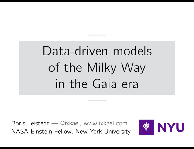note describing a model of the positions, velocities, proper motions, and colors of stars. If the likelihood function of those is a multivariate Gaussian (which is the case for Gaia, with strong correlations between parallaxes and proper motions), one can adopte a Gaussian Mixture model for their distributions (joint or split) and analytically marginalize over the true velocity, and colors of each star. As a result, one only need to sample the parameters of the mixture model, as well as the distance and extinction of each star. The e↵ective likelihood function is a simple multivariate Gaussian, derived below. This opens the possibility to implement this model in fast inference/modelling languages like Tensorflow, Stan, or Edward. A summary of the notation is provided in the table below. Apologies if there are typos in the text or equations! ↵ = (↵1, · · · , ↵B ) All parameters of the mixture model ↵b = (fb, ⇠b , ⌃b ) Parameters of the b Gaussian of the mixture i Index of the ith star ni = (↵i, i ) True/observed angular position ri True distance vi = (vx,i, vy,i, vz,i ) True 3D cartesian velocity ˆ µi = (µ↵,i, µ ,i ) Observed proper motion ˆ $i Observed parallax Ei ! Emi , ECi True magnitude/color extinction at distance ri Ci, ˆ Ci True and observed color Mi True absolute magnitude ˆ mi Observed apparent magnitude 1 Model Our population/distribution model in 8-dimensional space (3D positions and velocities, plus 2D color–magnitude diagram) is a Gaussian mixture, [v n r C M]T ↵ ⇠ B X b=1 fb N8D ⇠b ; ⌃b . (1) The priors will be specified later. Typically, one would adopt conjugate priors which greatly simply the inference, i.e. a Dirichlet prior on the amplitudes {fb }, and multivariate Gaussian for each mean ⇠b , and Wishard for the covariance ⌃b . The full 5-dimensional likelihood, accounting for any covariance between the measurements, is [ˆ µ↵,i ˆ µ ,i ˆ $i ˆ Ci ˆ mi ]T vi, ni, ri, Ei, Ci, Mi ⇠ N5D ⇣ i ; i ⌘ (2) with the model vector 2 3 and proper motions), one can adopte a Gaussian Mixture model for their distributions (joint marginalize over the true velocity, and colors of each star. As a result, one only need to sam mixture model, as well as the distance and extinction of each star. The e↵ective likelihood funct Gaussian, derived below. This opens the possibility to implement this model in fast inference Tensorflow, Stan, or Edward. A summary of the notation is provided in the table below. Apologies if there are typos in t ↵ = (↵1, · · · , ↵B ) All parameters of the mix ↵b = (fb, ⇠b , ⌃b ) Parameters of the b Gauss i Index of the ith star ni = (↵i, i ) True/observed angular po ri True distance vi = (vx,i, vy,i, vz,i ) True 3D cartesian velocity ˆ µi = (µ↵,i, µ ,i ) Observed proper motion ˆ $i Observed parallax Ei ! Emi , ECi True magnitude/color ext Ci, ˆ Ci True and observed color Mi True absolute magnitude ˆ mi Observed apparent magni 1 Model Our population/distribution model in 8-dimensional space (3D positions and velocities, plus 2D is a Gaussian mixture, [v n r C M]T ↵ ⇠ B X b=1 fb N8D ⇠b ; ⌃b . The priors will be specified later. Typically, one would adopt conjugate priors which greatly s Dirichlet prior on the amplitudes {fb }, and multivariate Gaussian for each mean ⇠b , and Wish The full 5-dimensional likelihood, accounting for any covariance between the measurements Gaussian mixture model: Infer the distributions from the data (here in 8D) Analytic or numerical marginalization of latent parameters.