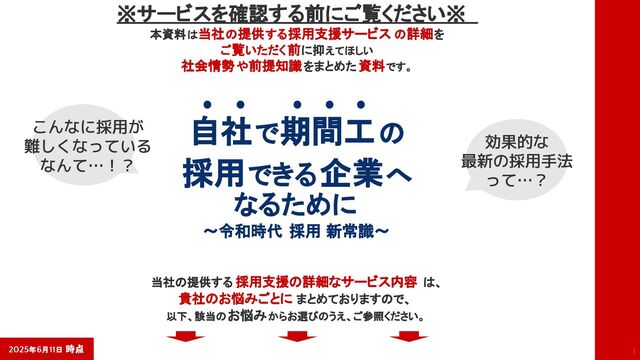 なるために 本資料は当社の提供する採用支援サービス の詳細を ご覧いただく前に抑えてほしい 社会情勢や前提知識をまとめた 資料です。 2025年6月11日 時点 当社の提供する 採用支援の詳細なサービス内容 は、 貴社のお悩みごとに まとめておりますので、 以下、該当のお悩みからお選びのうえ、ご参照ください。 ~令和時代 採用 新常識~ 1 こんなに採用が 難しくなっている なんて…!? ※サービスを確認する前にご覧ください※ 効果的な 最新の採用手法 って…?