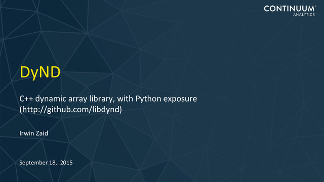 classes – Write a class, get a type • Types expose dynamic features to arrays – Either properties, like .real() or .imag(), or behavior, like .conj() • Types can be kinds, patterns, or constraints – Int, Scalar, Fixed, or Any; Fixed * T or (N * T, T) -> T; C[3 * 2 * float64] • Array metadata can describe data other than strided – Offset (tuple or struct), indirect (pointer), ragged (variable-sized dimensions) • Array data is poolable or allocatable in custom memory spaces – Variable-sized strings or dimensions; CUDA