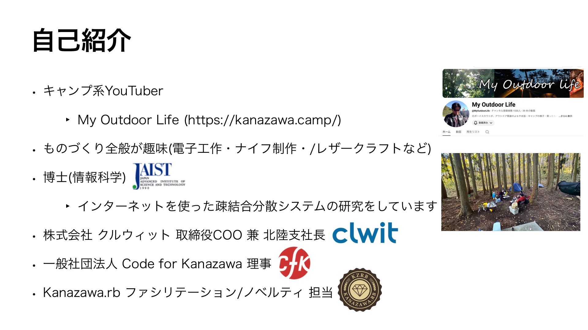 ࣗݾհ w Ωϟϯϓܥ:PV5VCFS ‣ .Z0VUEPPS-JGF IUUQTLBOB[BXBDBNQ w ͷͮ͘Γશൠ͕झຯ ిࢠ࡞ɾφΠϑ੍࡞ɾϨβʔΫϥϑτͳͲ