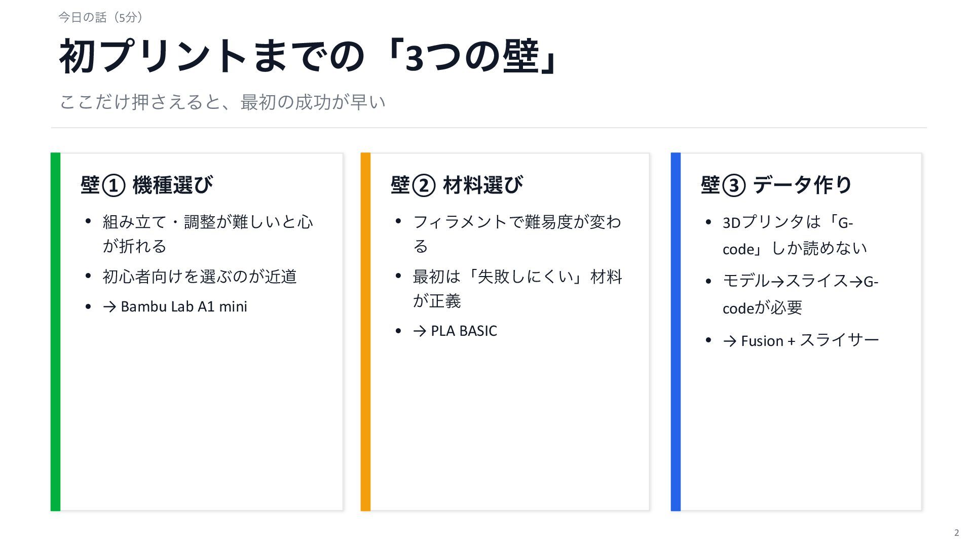 • → Bambu Lab A1 mini น② ࡐྉબͼ • ϑΟϥϝϯτͰқ͕มΘ Δ • ࠷ॳʮࣦഊ͠ʹ͍͘ʯࡐྉ ͕ਖ਼ٛ • → PLA BASIC น③ σʔλ࡞Γ • 3DϓϦϯλʮG- codeʯ͔͠ಡΊͳ͍ • Ϟσϧ→εϥΠε→G- code͕ඞཁ • → Fusion + εϥΠαʔ 2
