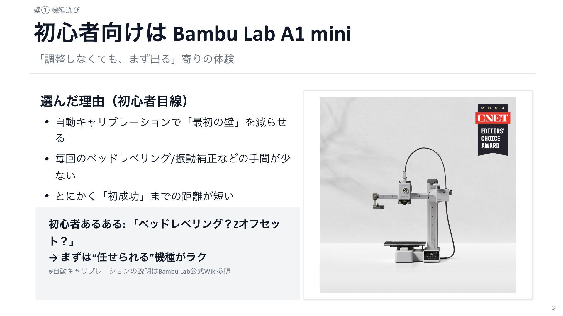 น① ػछબͼ ॳ৺ऀ͚ Bambu Lab A1 mini ʮௐ͠ͳͯ͘ɺ·ͣग़ΔʯدΓͷମݧ બΜͩཧ༝ʢॳ৺ऀઢʣ •